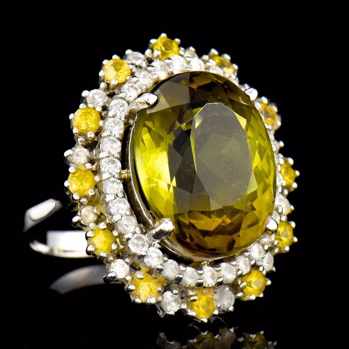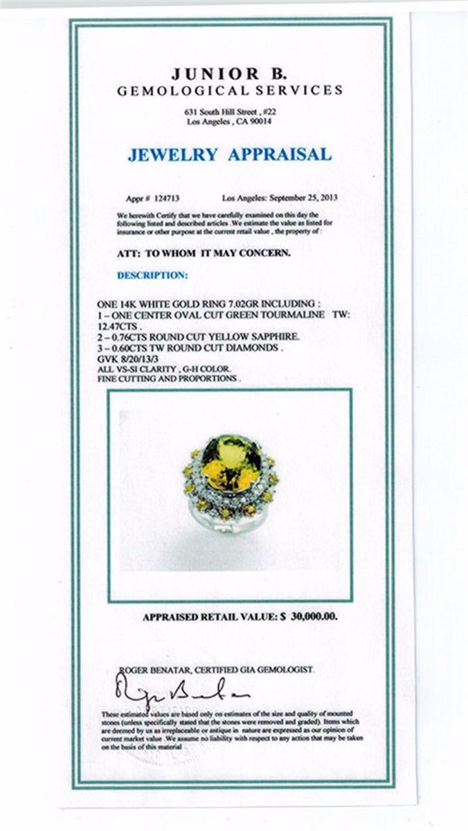 ONE CENTER OVAL CTU GREEN TOURMALINE TW:12.47CTS, 0.76 CTS ROUND CUT YELLOW SAPPHIRE & 0.60CTS TW ROUND CUT DIAMONDS. ONE 14K WHITE GOLD RING 7.02G