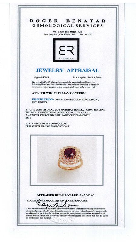 ONE CENTER OVAL CUT NATURAL BURMA RUBY TW:4.60CTS, 0.74CTS TW ROUND BRILLIANT CUT DIAMONDS, 14K ROSE GOLD RING 6.56GR