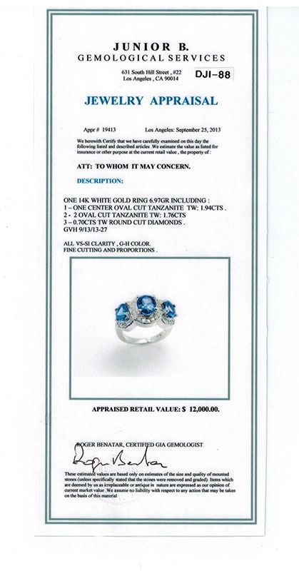 ONE CENTER OVAL CUT TANZANITE TW: 1.94CTS, 2 OVAL CUT TANZANITE TW:1.76CTS, 0.70CTS TW ROUND CUT DIAMOND, 14K WG RING 6.97GR