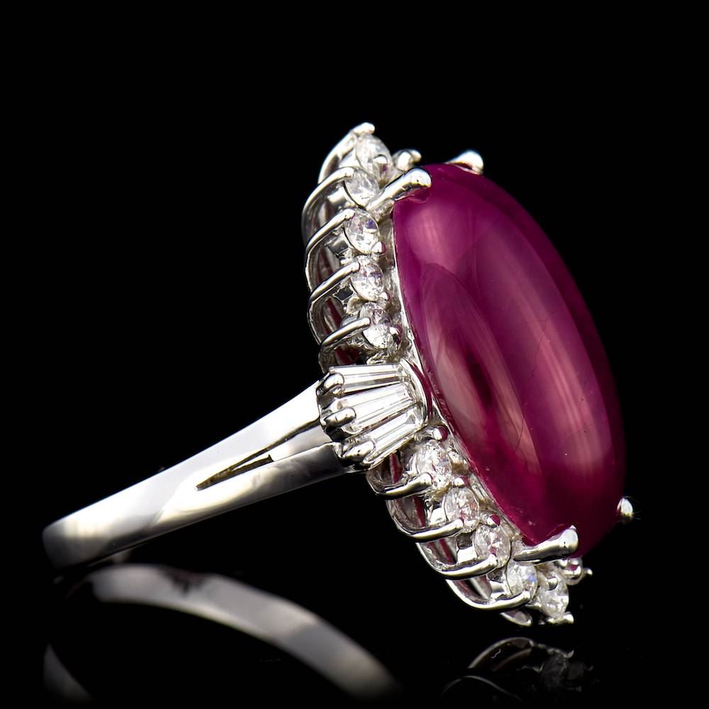 ONE CENTER OVAL SHAPE NATURAL CABOCHON RUBY TW 11.48CTS, NO LEAD FILLING, 0.84CTS TW ROUND CUT AND BAGUETTE DIAMONDS, 14K WG RING 5.06GR