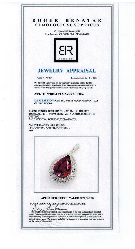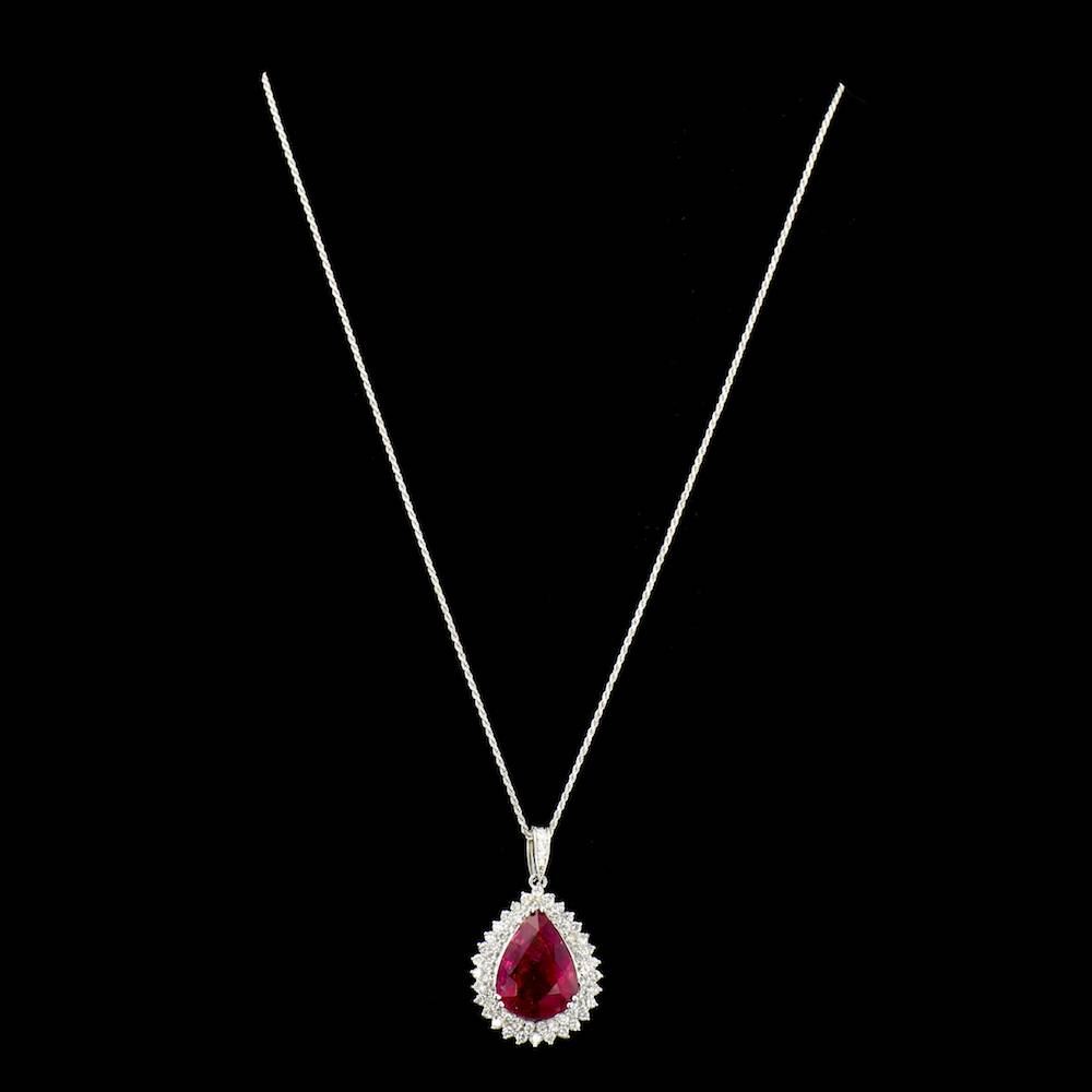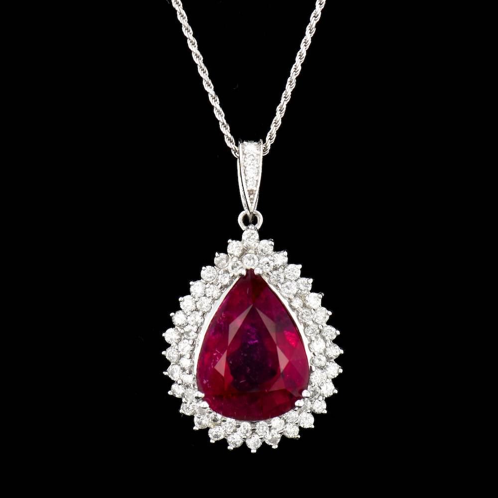 ONE CENTER PEAR SHAPE NATURAL RUBELLITE TOURMALINE TW 19.54CTS, 2.65CTS TW ROUND CUT DIAMONDS, 18K WG PENDANT 9.08GR