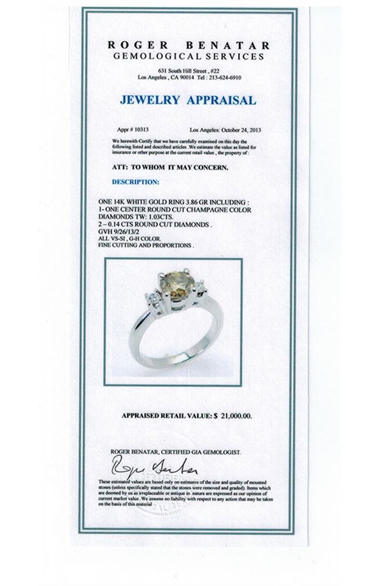 ONE CENTER ROUND CUT CHAMPAGNE COLOR DIAMOND TW: 1.03CTS, 0.14CTS ROUND CUT DIAMONDS, 14K WG 3.86GR