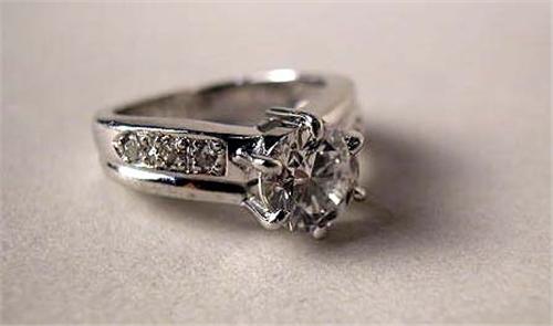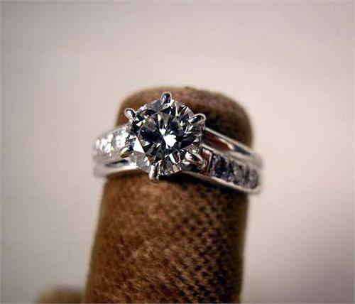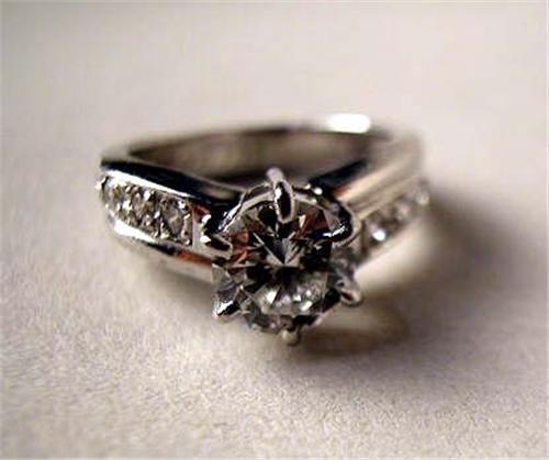 ONE DIAMOND AND PLATINUM ENGAGEMENT RING With a center round diamond, weighing apx. .98 carat, SI1, H-I, flanked on each side by three circular diamonds, total estimated weight .18 carat, VS1/VS2, F-G, stamped "Pt 900 1.00