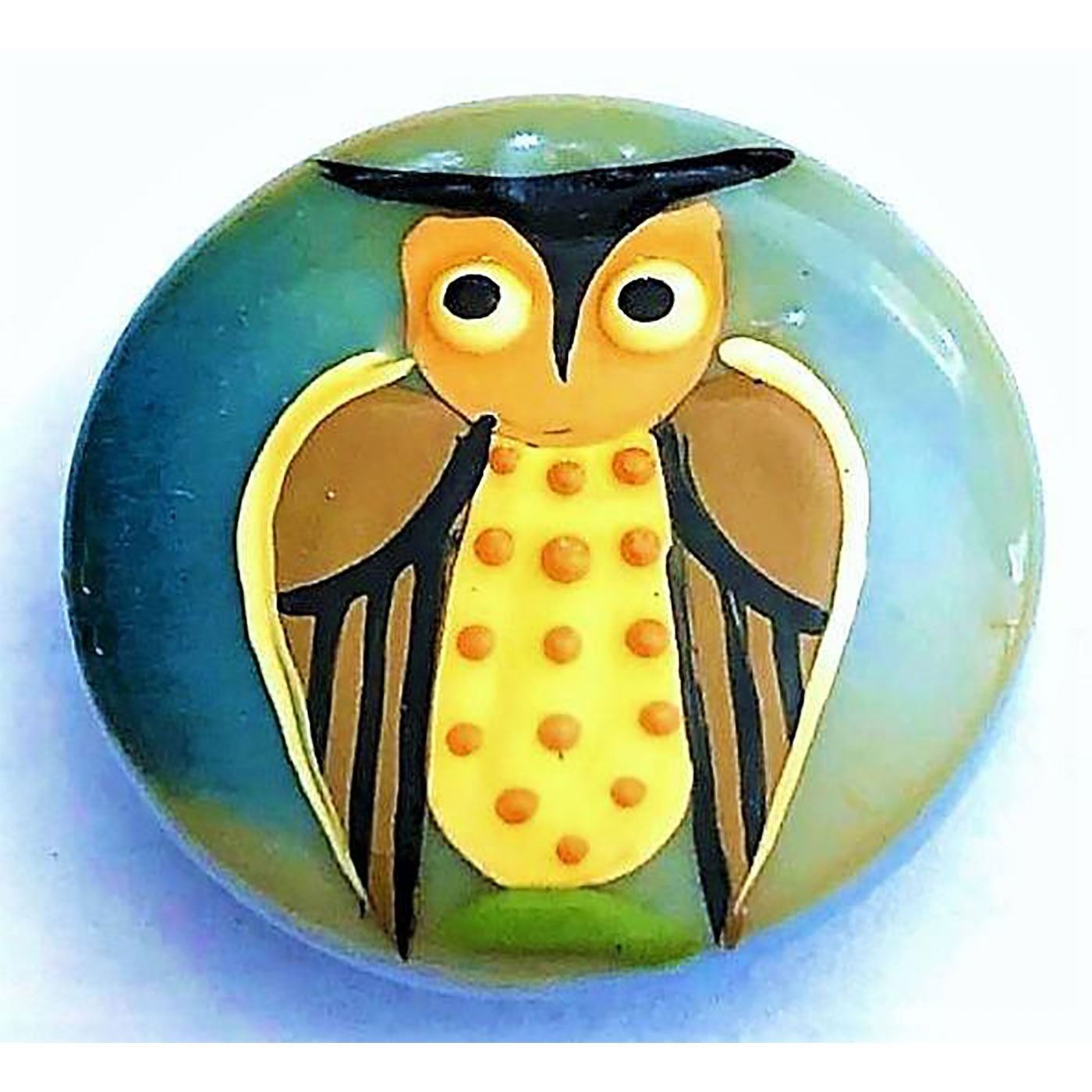 A small size hand painted owl button by the Brooks couple. These buttons over the years have certainly become desirable among collectors and no wonder why, they are beautifully painted, very colorful, come in a wide range of subject matter and have a charm all of their ow. Hand painted on casein plastic by the English couple Edith and Alan Brooks.