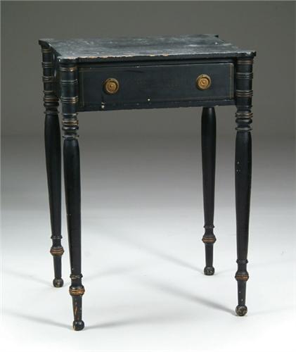 ONE DRAWER FEDERAL STAND IN BLACK. Single dovetailed drawer with two ring pulls, cookie corner top with ring and turned legs. Some stencil decoration. SIZE: 29in. h x 20-1/2in. w x 16-3/4in. d. CONDITION: Crack in top, chip off ball feet, otherwise good. 9-26581