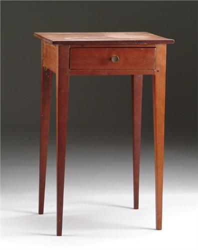 ONE DRAWER HEPPLEWHITE CHERRY STAND. Tapered square legs, dovetailed drawer having brass knob. SIZE: 28-1/2in. h x 18in. w x 15in. d. CONDITION: Top has slight staining but generally very good. 9-26123