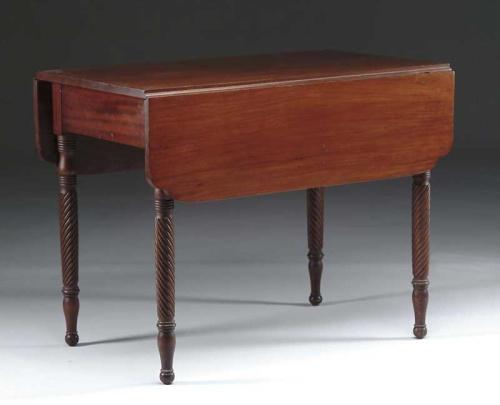ONE DRAWER MAHOGANY SPIRAL LEG PEMBROKE TABLE. Shaped dropped leaves. The drawer never fitted with brass. Fine spiral turnings on a ring turned leg. SIZE: 28” h x 36” d x 20-1/4” (closed); 40-3/4” (open). CONDITION: Very good. 9-27381