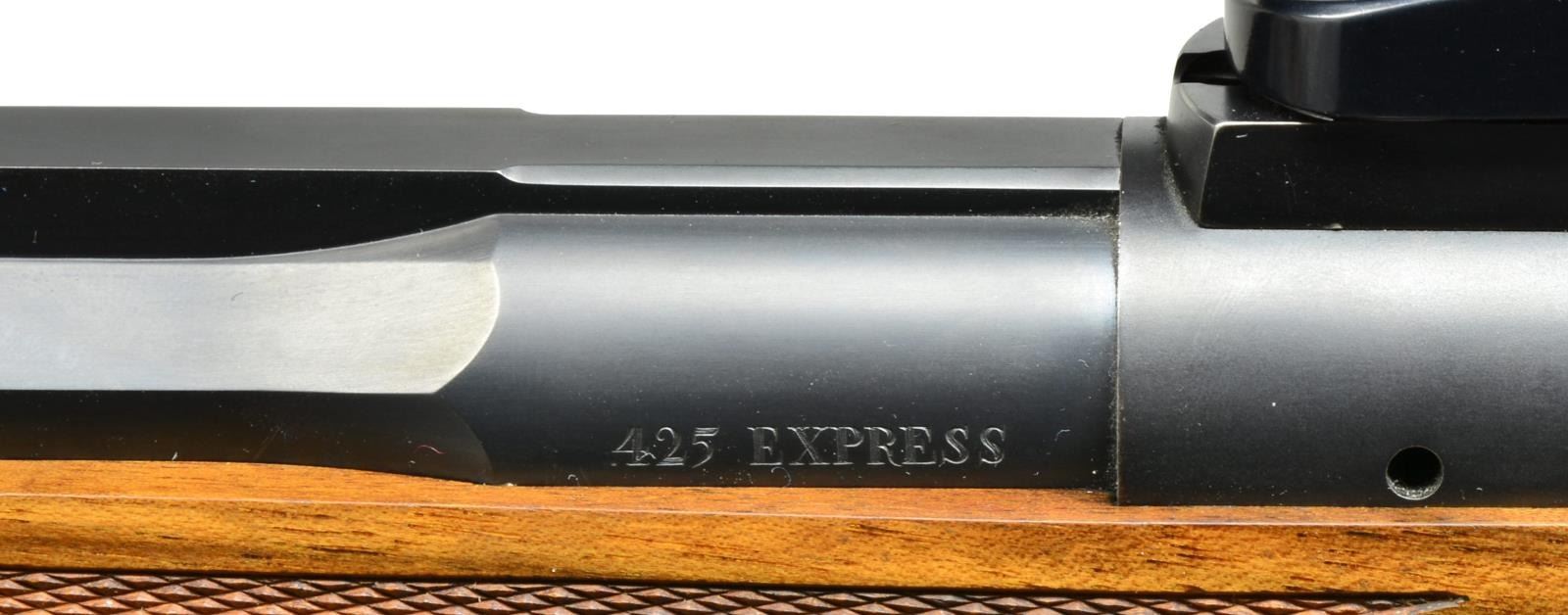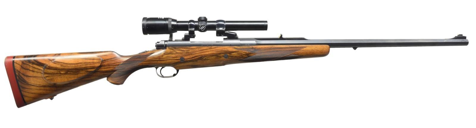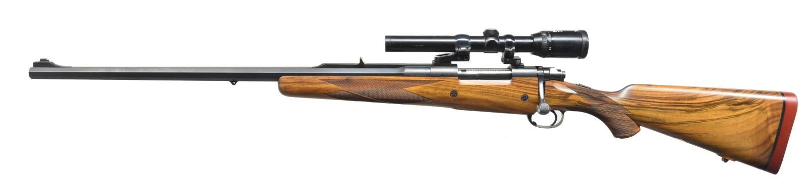 CUSTOM MADE LEFT HAND BOLT RIFLE BY GENE SIMILLION MADE FOR NOTED GUN WRITER JAMES E. FENDER; THE SUBJECT OF A "GUNS" MAGAZINE ARTICLE WITH TRAVEL CASE, AMMO, DIES, & A LIFETIME'S WORTH OF COMPONENTS. Cal. .425 Express (300 Win Mag. necked up to accept .423 diameter bullets, AKA .425 Ruger). S# 0260. Bbl. 24 1/2". Jim Fender is known to the readers of "The Double Gun Journal" & other magazines for his well-detailed & poignant articles covering a wide variety of subjects. His latest being a synopsis of the life & creations of Jean Samuel Pauley, the inventor of the base fire cartridge & its breech loading gun, forerunner to all modern breech loaders. Jim has been on many African safaris & has done a great amount of hunting in North & South America. He has taken nearly 40 cape buffalo. After years of experience he decided to build his once in a lifetime all-purpose rifle which is for sale here today. An article he wrote for "Guns" magazine in 1990 outlines his previous hunting experience with other rifles as well as the reasons how & why he built this truly fine left handed rifle in .425 Express. He also relates the personal interaction needed to complete the project. The 24 1/2" tapered octagon barrel is fitted with what appear to be integral quarter rib & front sight ramp. Rib is fitted with 1 standing leaf express rear sight with warthog ivory triangle as a sighting aid. An ivory bead is in front sight base. Beads are interchangeable & held in place by a spring loaded button at front of ramp. Top flat of barrel is engraved "Gene Simillion - Gunmaker". Gene's serial number (31) is at right rear & caliber is engraved on left. Dakota Arms "76" left handed action has been fitted with long top tang which extends over comb in H&H fashion. A nonautomatic safety is installed "in the right place" behind bolt on top tang ("SAFE" inlaid in gold) which locks bolt in closed position when engaged. Bolt body & follower are engine turned & knob is checkered in 4 round panels with some engraving at bottom. Standard trigger is retained & drop box bottom metal has hinged floorplate with retaining button in trigger guard bow. Stock of a fine piece of thin shell walnut with good grain flow through grip (that Jim had in possession for a long time) is nicely veined & has some figure in butt. Stock measures 14 3/8" over red Silver type pad & features classically styled shadowline left hand cheekpiece, steel grip cap with trap (spare front sights in trap), recoil bolts with extra recoil lug in barrel channel. Very nicely cut point pattern borderless checkering at grip & around forend & a sling eye in raised portion of stock on toeline along with a gold oval engraved "JEF". Gene Simillion's work in both metal & wood is beyond reproach with clean, sharp lines & attention to detail. Rifle is fitted with Zeiss "Diavari" - C 1.5-4.5x scope with duplex reticle & "Bock" (EAW) QD rings & bases. WEIGHT: 8 lbs. 15 oz. with 0 scope. UNATTACHED ACCESSORIES: gun is housed in a "Vermont Custom Cases" metal travel case lined in burgundy velvet with space for scope & bolt. Case contains 1 box of A Square "lion loads" & attachable wheels to aid transit as well as 2 keys. Also included are 2 orange "Contico" plastic boxes, 1 containing a large amount of unfired but formed cases, 10 boxes of 25 A-Square "lion load" bullets, Redding loading dies. The other box contains a number of fired cases, some loaded A-Square ammunition with "dead tough" bullets, .425 Ruger express loading dies, 2 boxes of A-Square ammunition loaded with monolithic solids, 16 boxes of A-Square 400 grain "dead tough" bullets, & a partial box of Cor Bon 350 grain spire point bullets. Also included are James E. Fender's notes, issue of "GUNS" magazine containing previously mentioned article, & table display of article. CONDITION: very fine. His notes relate "the rifle is extremely accurate, & has been hunted extensively, but never abused. It has accounted for Arctic grizzly, Dall sheep, & African plains game too numerous to mention." There is some very slight high edge wear to metal parts with a bit of flecking on top tang near comb. There are a few minor marks from handling in wood finish, most notably a 1/2" ding on cheekpiece & an area of small dings & scratches on left side near forend tip & in front of bolt. Scope mounts show marks from considerable mounting & dismounting. Bore is excellent, bright, sharp & shiny throughout. Mechanically excellent. Case is very fine with some marks, interior is excellent. An outstanding, great handling rifle. (20-2400/MGM62). MODERN. $10,000-15,000.