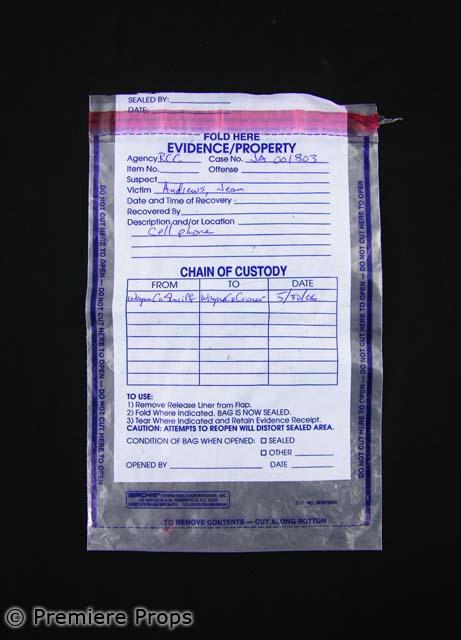 From the horrifying film, this is a screen used Evidence/Property bag that was used for Jean Andrew's cell phone. The info is filled out, but the cell phone is not included. The prop measures approximately 11.75" x 7.5".