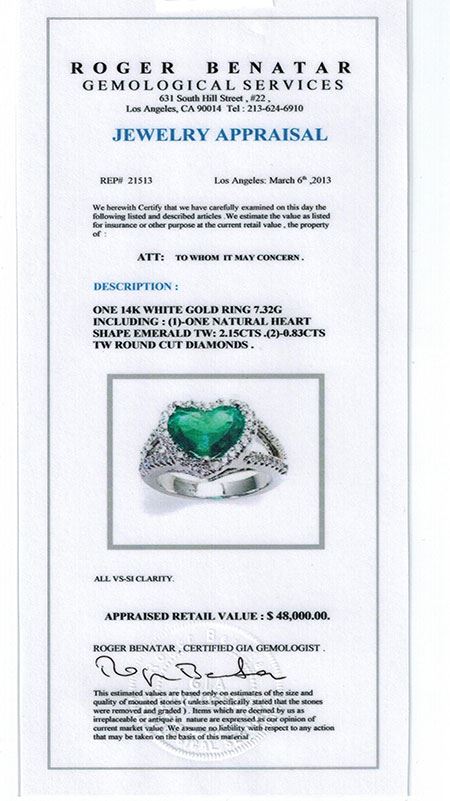 ONE NATURAL EMERALD HEART SHAPE TW:2.15CTS , 0.83CTS TW ROUND CUT DIAMONDS, 14KWG RING 7.32GR