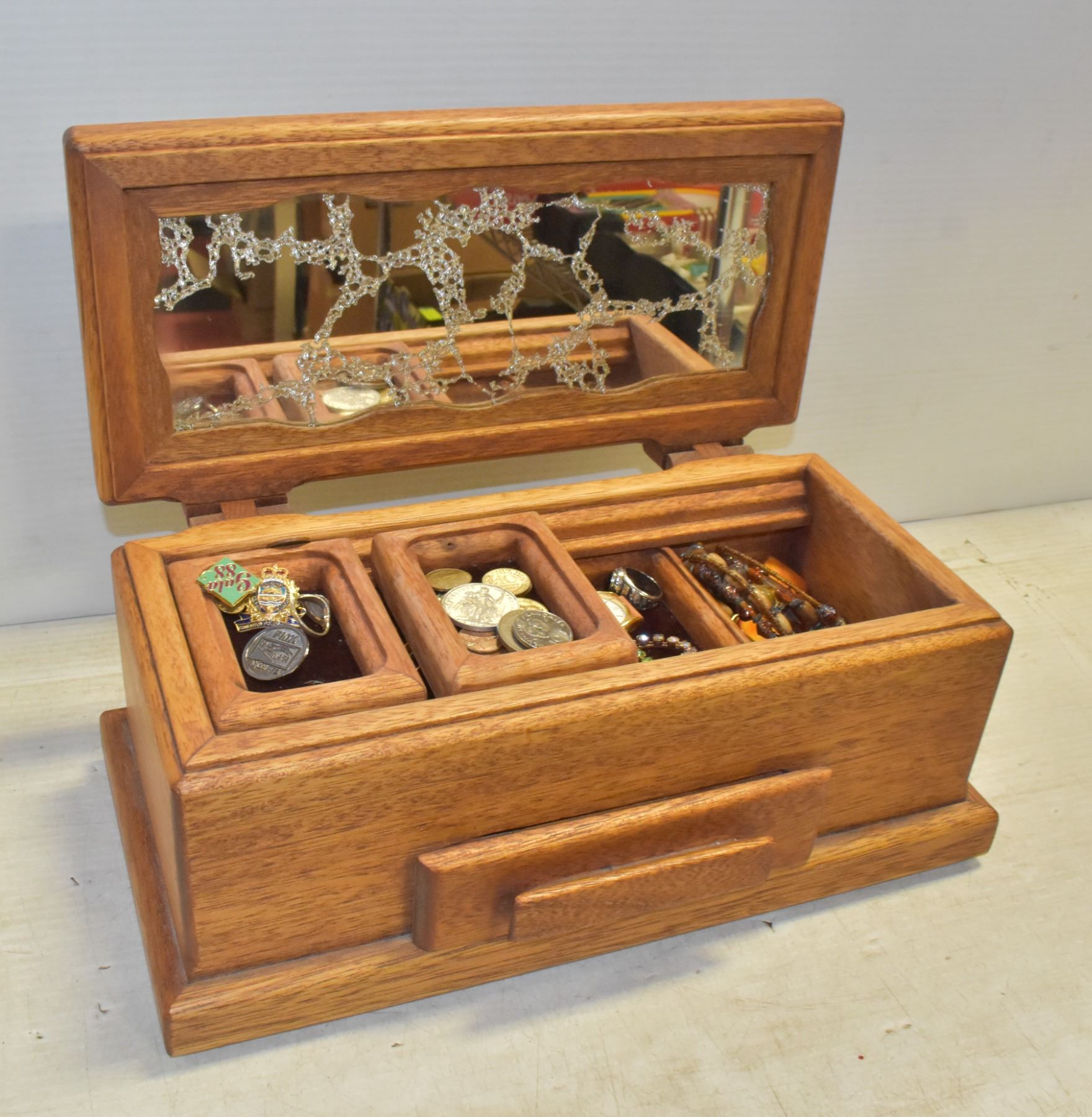BOX WITH INNER MIRROR, 2 SLIDING STORAGE AREAS, 3 EXTRA STORAGE AREAS AND 1 DRAWER - FULL OF JEWELLERY, COINS, PINS, SILVER RING, COLLECTIBLE PINS, WATCHES & MORE**ALL ITEMS MUST BE REMOVED BY 5PM SATURDAY, OCTOBER 1ST, 2022. ALL REMAINING ITEMS WILL BE SUBJECT TO A $6.00 PER DAY STORAGE CHARGE. ANY ITEMS REMAINING AFTER MONDAY, OCTOBER 15, 2022 WILL BE CONSIDERED FORFEITED. NO REFUNDS WILL BE ISSUED FOR FORFEITED ITEMS. TO SCHEDULE A PICK UP APPOINTMENT CLICK HERE