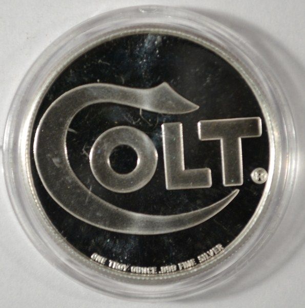 ONE OUNCE SILVER ART ROUND FROM THE COLT FIRE ARMS SERIES, EST $55.00 TO $65.00