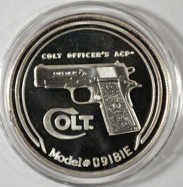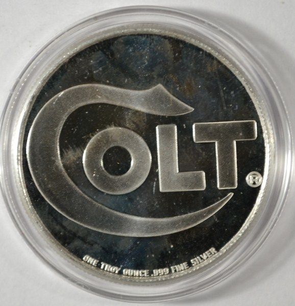 ONE OUNCE SILVER ART ROUND FROM THE COLT FIRE ARMS SERIES, EST $55.00 TO $65.00