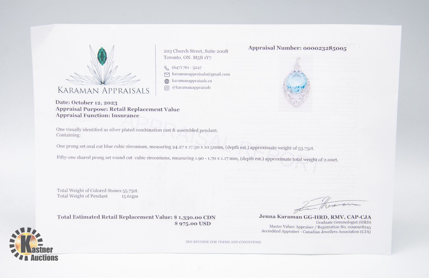 53.75 CARAT SET IN PLATED PENDANT WITH 51 ROUND CUT CUBIC ZIRCONIUM APPROXIMATE TOTAL WEIGHT OF 2.00 CARAT APPRAISED VALUE $1,330.00 **ALL ITEMS MUST BE REMOVED BY 5PM SATURDAY, DECEMBER 30TH 2023. ALL REMAINING ITEMS WILL BE SUBJECT TO A $6.00 PER DAY STORAGE CHARGE. ANY ITEMS REMAINING AFTER MONDAY, JANUARY 8TH, 2023 WILL BE CONSIDERED FORFEITED. NO REFUNDS WILL BE ISSUED FOR FORFEITED ITEMS. TO SCHEDULE A PICK UP APPOINTMENT CLICK HERE