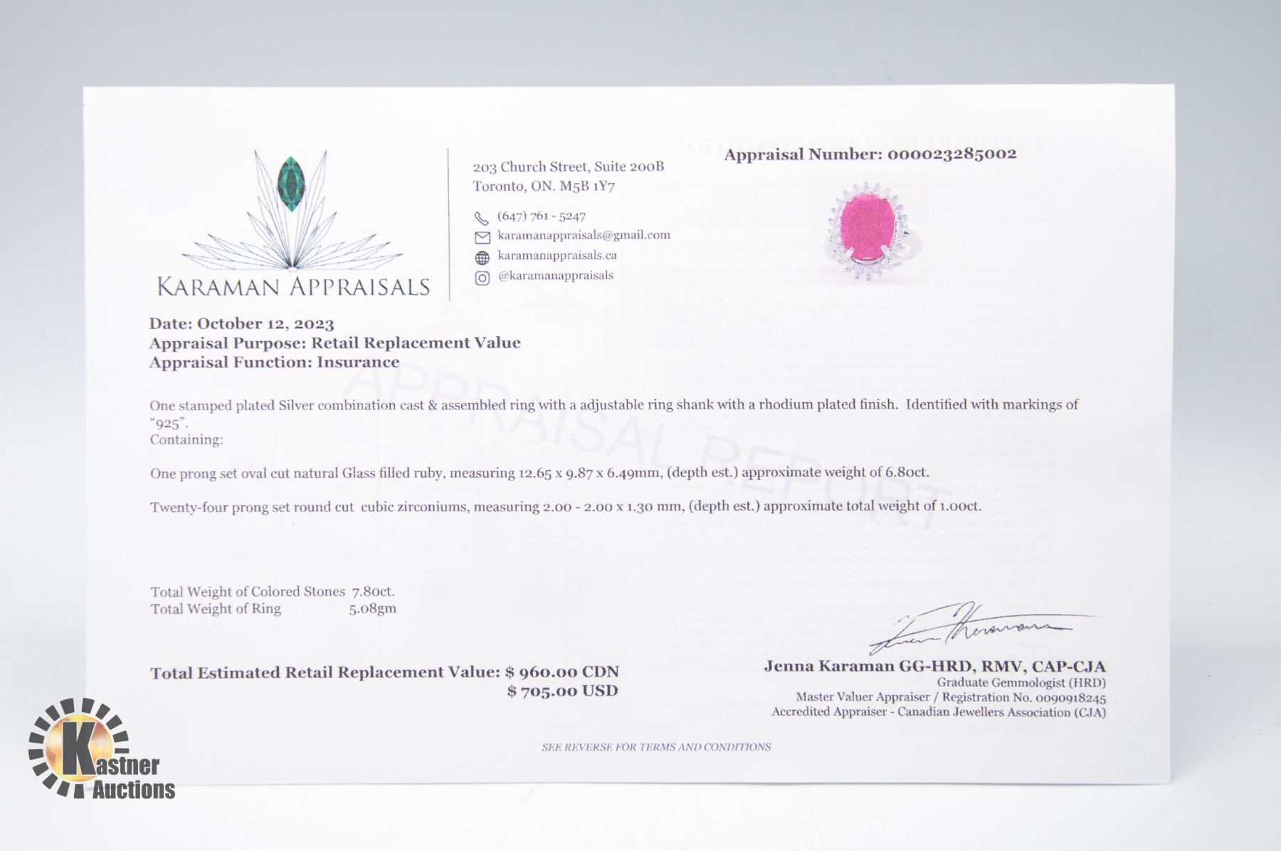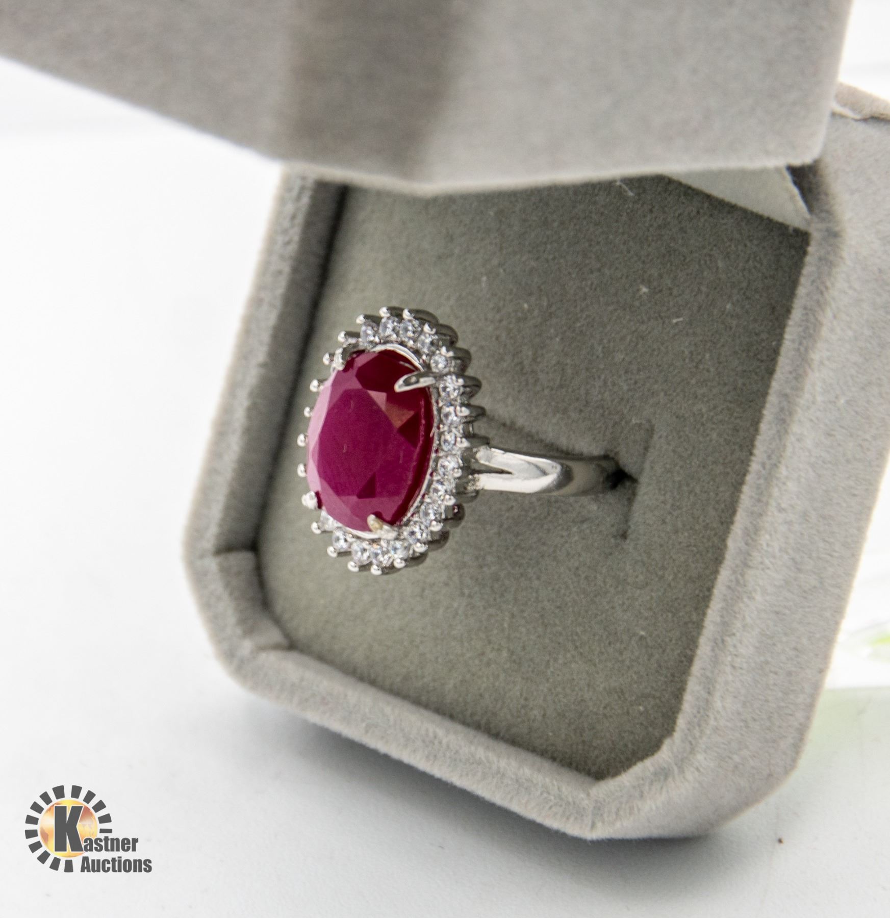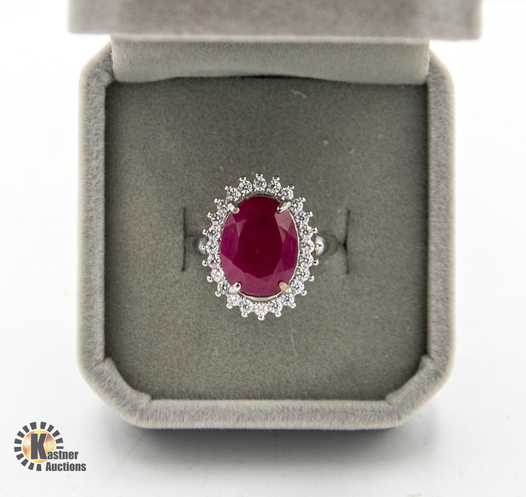 APPROXIMATELY 6.80 CARAT WITH 24 ROUND CUBIC ZIRCONIUM SURROUNDING THE RUBY WEIGHING APPROXIMATELY 1.00 CARAT RING SIZE ADJUSTABLE APPRAISED VALUE $960.00 **ALL ITEMS MUST BE REMOVED BY 5PM SATURDAY, DECEMBER 30TH 2023. ALL REMAINING ITEMS WILL BE SUBJECT TO A $6.00 PER DAY STORAGE CHARGE. ANY ITEMS REMAINING AFTER MONDAY, JANUARY 8TH, 2023 WILL BE CONSIDERED FORFEITED. NO REFUNDS WILL BE ISSUED FOR FORFEITED ITEMS. TO SCHEDULE A PICK UP APPOINTMENT CLICK HERE