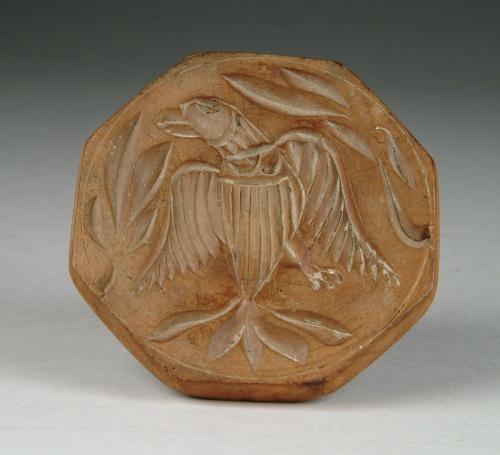 ONE PIECE CARVED EAGLE BUTTER PRINT. The spread wing eagle surrounded by leaves in an octagon form. SIZE: 3-3/4in. dia. CONDITION: Very good. 9-25366