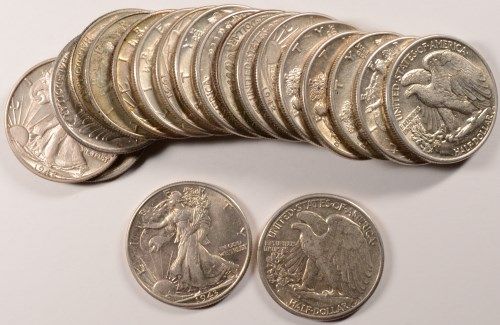 ONE ROLL ( 20 ) COINS MIXED DATE, AU WALKING LIBERTY HALF DOLLARS 1947 & OLDER