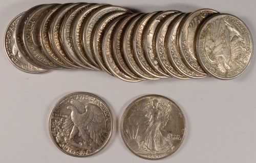 ONE ROLL ( 20 ) MIXED DATE AU WALKING LIBERTY HALF DOLLARS, 1947 AND OLDER