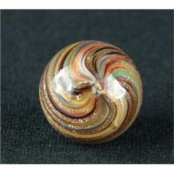 ONIONSKIN LUTZ MARBLE. This marble is 13/16" and has great colors including yellow, black, white, blue, green & orange with lines of gold between each color. There are 17 Lutz lines with each line going around the marble twice. CONDITION: Polished; near mint condition. WB 1-4651-31 (100-200)
