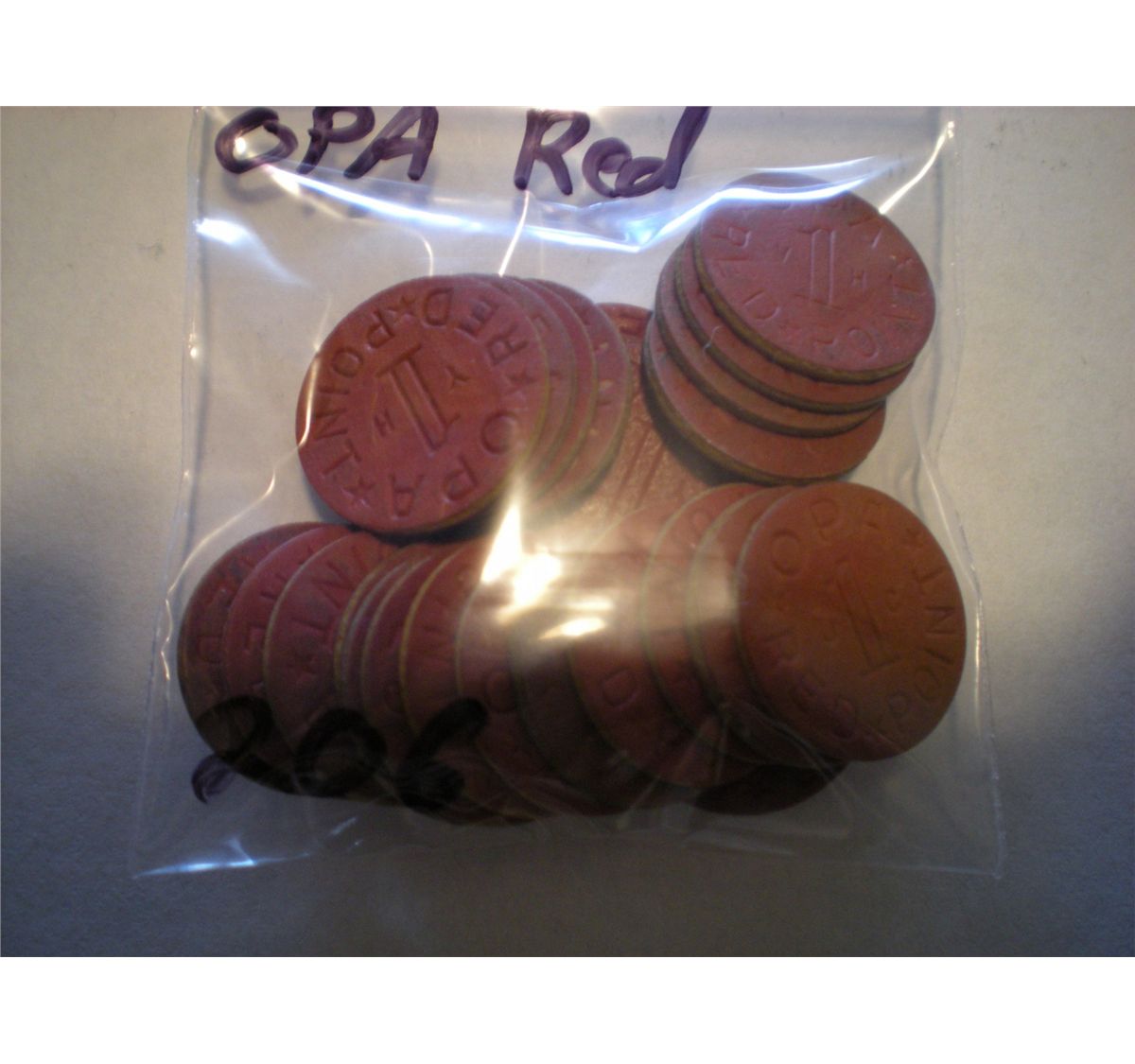 OPA Red Point Tokens x25 - This is a random selection of OPA Red Points***Coin, Currency, Gemstones & All Items Listed in this auction along with their respective Grades, Conditions and Values are not T&T Auctions Responsibility. Every person has their own opinion. It is the responsibility of the buyer to examine, grade and value each item in this auction to their own satisfaction before they bid. Bidders shall rely entirely on their own inspection and information before bidding.