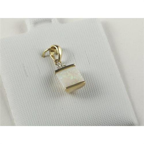 PENDANT: Contemporary 10k yellow gold pendant set with a square cabochon opal with three round cut accent diamonds. The opal measures approximately 1.00 cts, is semi-translucent and is white with flashes of orange green and blue. The diamonds measure approximately 0.03 ctw, have SI1 to I1 clarity and H color. Appraisal included.