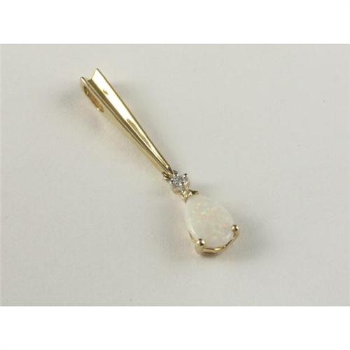 PENDANT: Dainty 10k yellow gold pendant set with a pear shape opal cabochon and a round cut diamond.  The opal measures approximately 0.70 cts, is semi translucent and is white with play of color.  The diamond measures approximately 0.03 cts, has I1 clarity and G color.  Appraisal included.