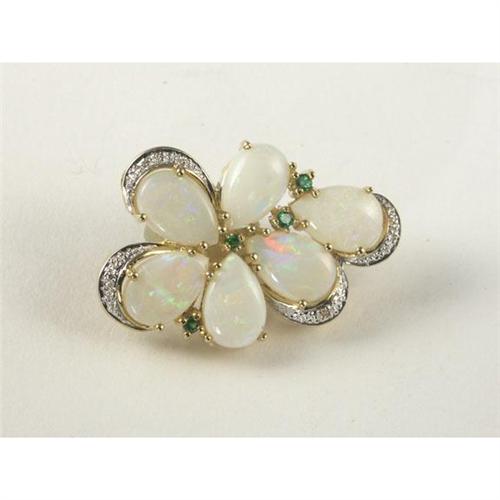 PENDANT: Biomorphic 10k yellow gold pendant set with six drop pear shape cabochons, four round cut diamonds and accented with pave set diamonds. The opals are white with flashes of green, blue and orange, are semi translucent and measure approximately 9.00 mm by 6.00 mm. The slightly dark green emeralds measure approximately 0.07 ctw and are semi transparent. The diamonds measure approximately 0.03 ctw, have SI2 to I1 clarity and H to I color. Appraisal included.