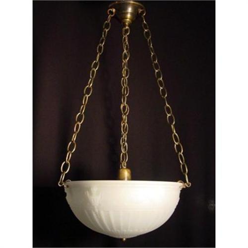 Circa 1920 a opaline glasss inverted dome chandelier detaiiled with urn and swag frieze over a fluted center has mounts and suspension chain dark patina.