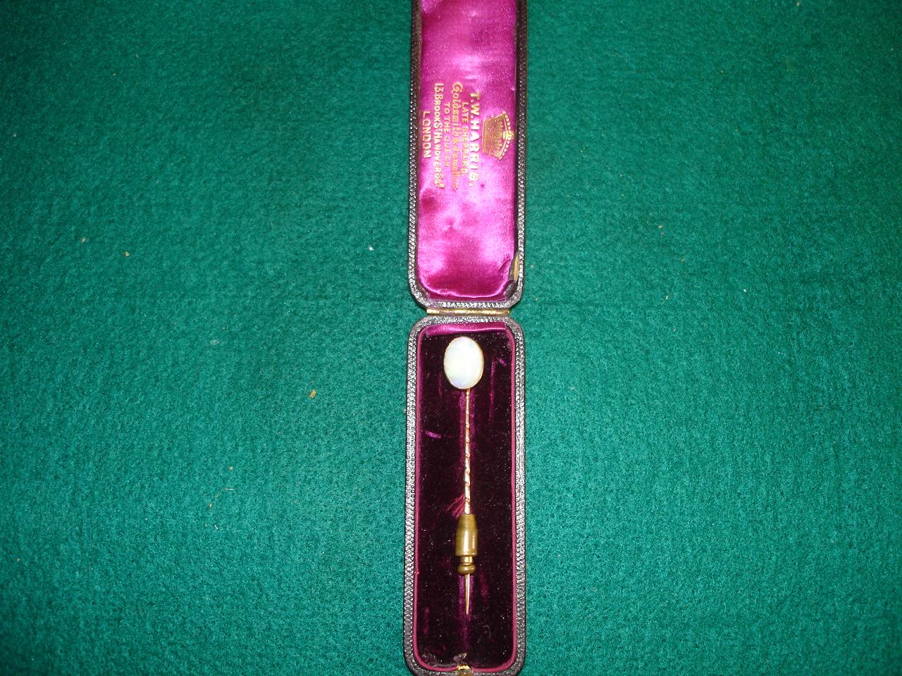 LOVELY OPAL PIN WITH 18KT GOLD PIN WITH LOVELY BOX T.W. HARRIS LATE SHEPPARD GOLDSMITHS TO THE QUEEN LONDON