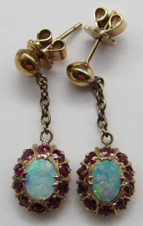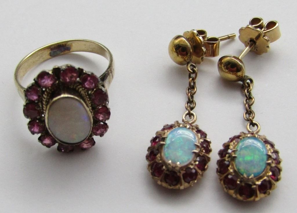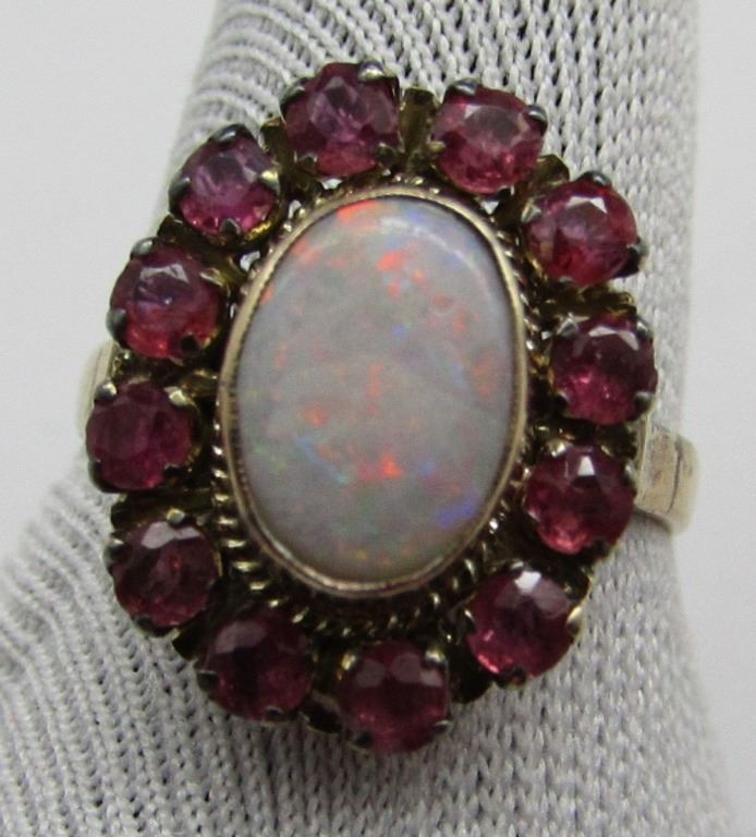 OPALS - SURROUNDED by PINK STONES, PIERCED EARRINGS, SIZE 4 3/4 RING, 4.9 dwt - NICE