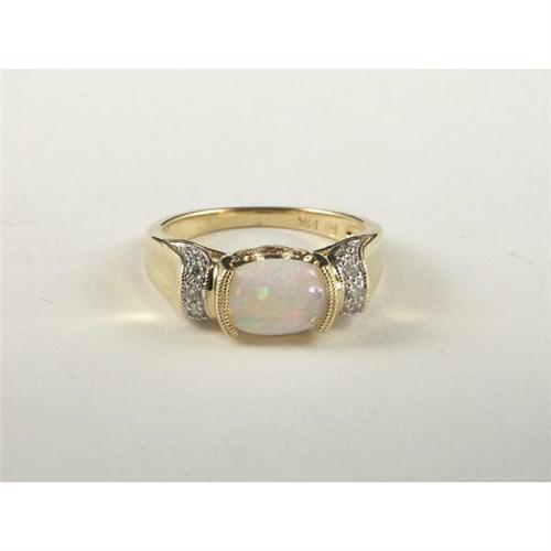 RING: Enticing 14k yellow gold ring set with an oval opal cabochon, two round cut tourmalines and accented with diamonds. The white opal measures approximately 1.00 cts and is semi-translucent. The pink tourmalines measure approximately 0.05 ctw and are transparent. The diamonds measure approximately 0.05 ctw, have VS1 to SI1 clarity and H color. Appraisal included.