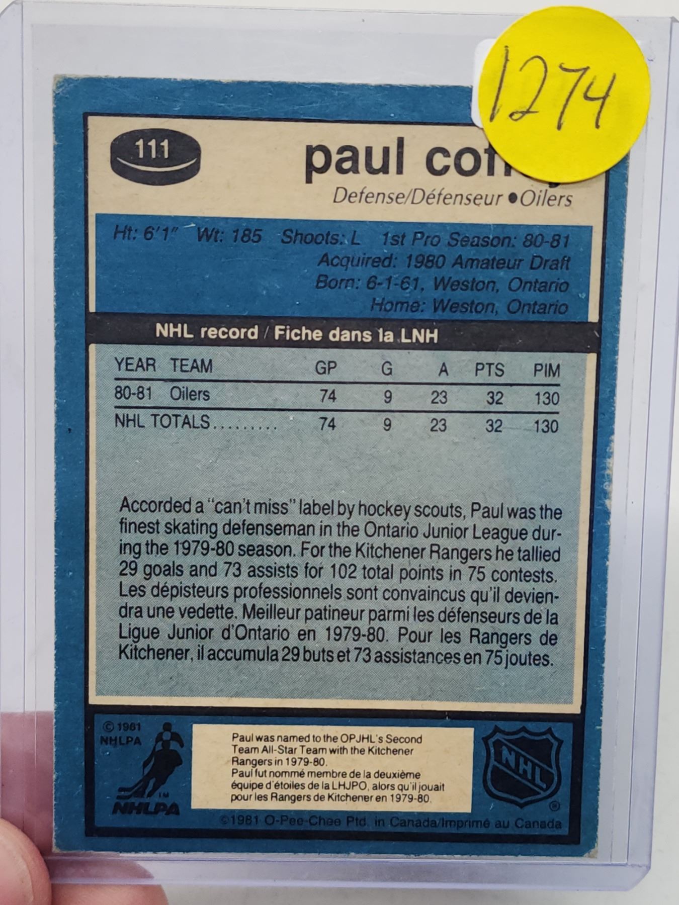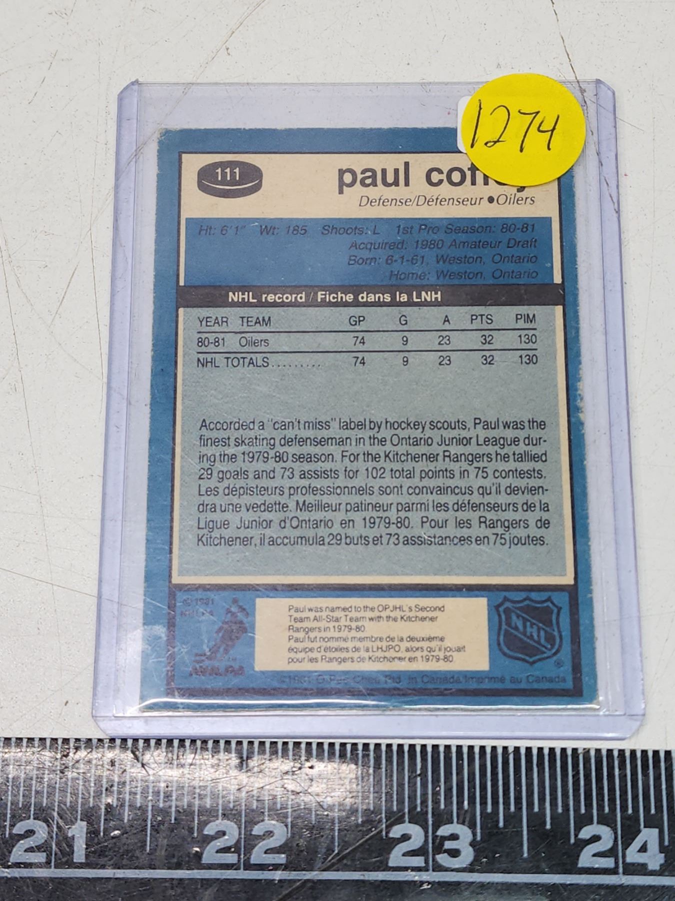 OPC Oilers, Paul Coffey hockey card 1981