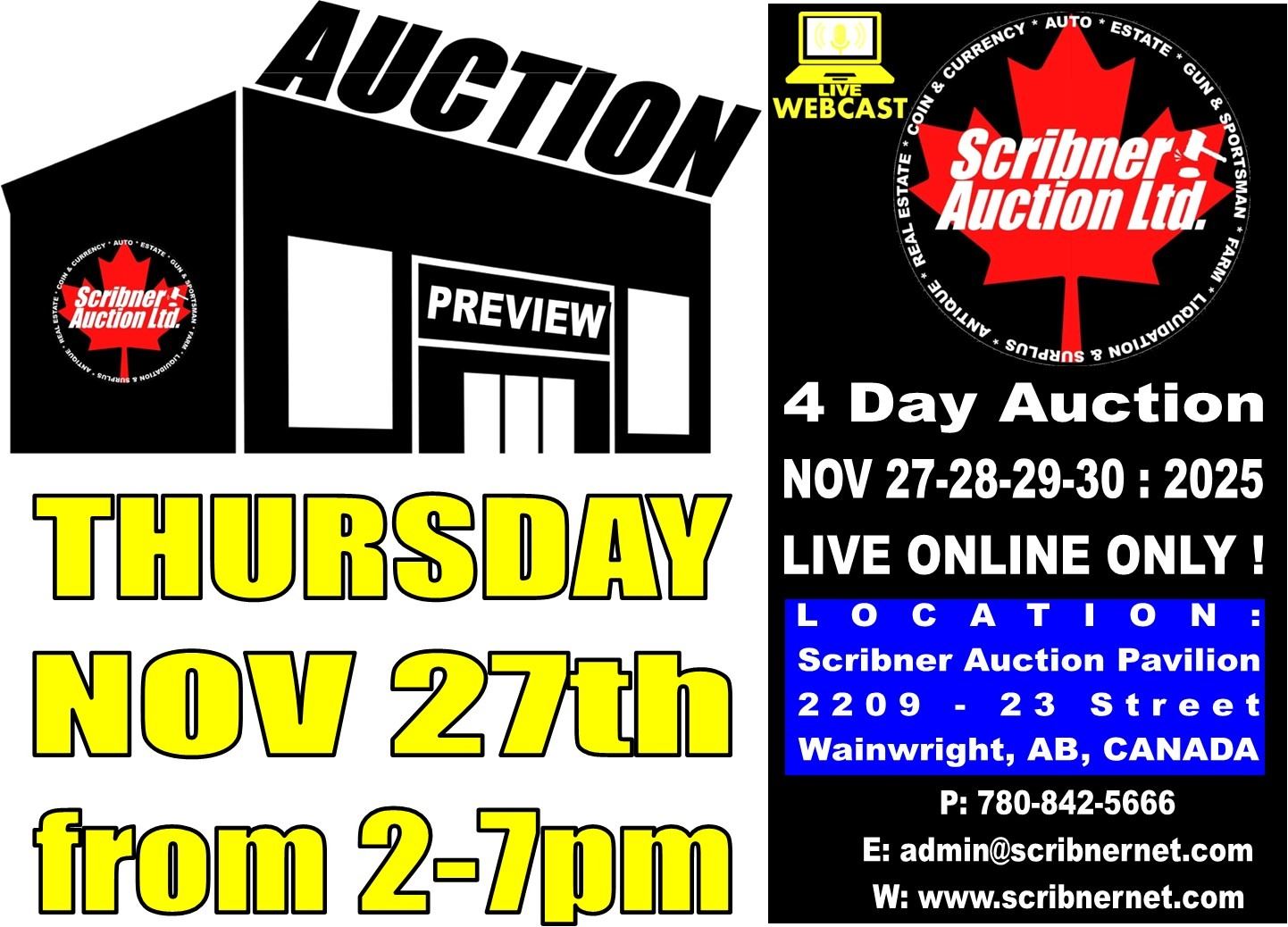 THURSDAY - FRIDAY - SATURDAY - SUNDAY : Purchases will be packaged up after the auction and shipped via Canada Post or PUROLATOR (please let us know which of those 2 Couriers you prefer) within 12-16 days of the auction sale. IF CANADA POST IS ON STRIKE we will be using Purolator. Purolator has offered us great rates competitive with Canada Post in some cases even better depending on location.Please contact us via email (reception.scribnerauction@gmail.com) or call 780-842-5666 prior to the auction if you wish to arrange alternate shipping. Shipping & Handling Charges will be charged to your credit card at the time of shipping. Most packages shipped via Canada Post come with $100 insurance. Please review Canada Post Terms & Conditions & Purolator Terms & Conditions for their respective Insurance Policies. If you want EXTRA Insurance from the carrier, you must instruct our office to purchase additional insurance! Scribner Auction Ltd. will not be responsible for any damage or breakage to any item for any reason (shipping, handling or otherwise). If you wish to arrange for Pick Up at our Wainwright, AB location, please call our office to make an appointment 780-842-5666. You MUST schedule an appointment (NO DROP INS PLEASE!)