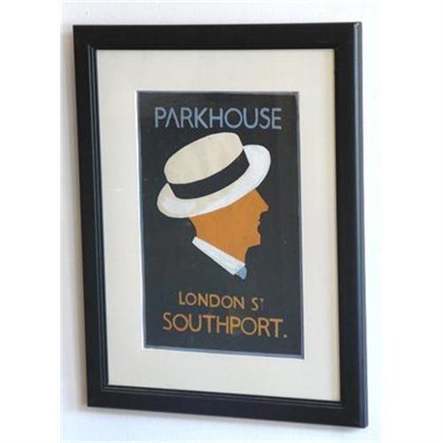 ORIGINAL GOUACHE PAINTING ON PAPER, A MAQUETTE, CREATED FOR THE PURPOSES OF MAKING A PRINTED ADVERTISEMENT. IN THIS CASE, THE AD IS FOR A HAT STORE. IT HAS SIMPLE, CLEAN LINES AND SHAPES. THE PIECE DATES FROM THE C.1930s PERIOD, BUT THE FRAME IS OF RECENT VINTAGE. SHIPPING PRICE INCLUDES INSURANCE IN USA. MAIL BY USPS. WE WILL BE AS FAIR AS POSSIBLE WITH OVERSEAS BUYERS. FOR GUARANTEED DELIVERY AND INSURANCE, WILL MOST LIKELY USE UPS WITH OVERSEAS BUYERS.