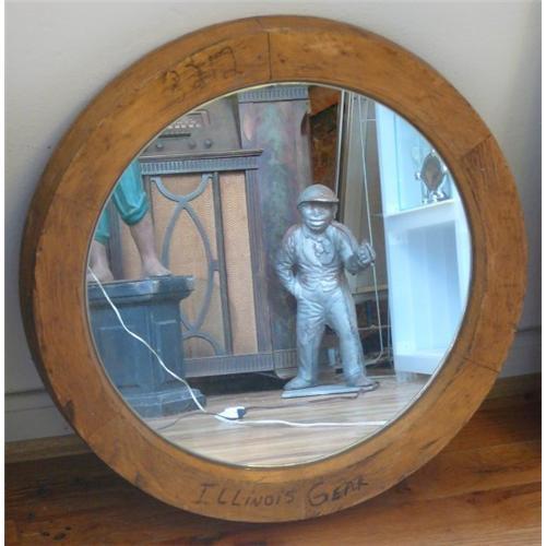 GREAT LITTLE MIRROR MADE FROM A WHEEL MOLD USED IN SANDCASTING IN THE EARLY 1900'S. THE MIRROR WAS ADDED IN 2005. THE MIRROR HAS A GREAT INDUSTRIAL ERA
