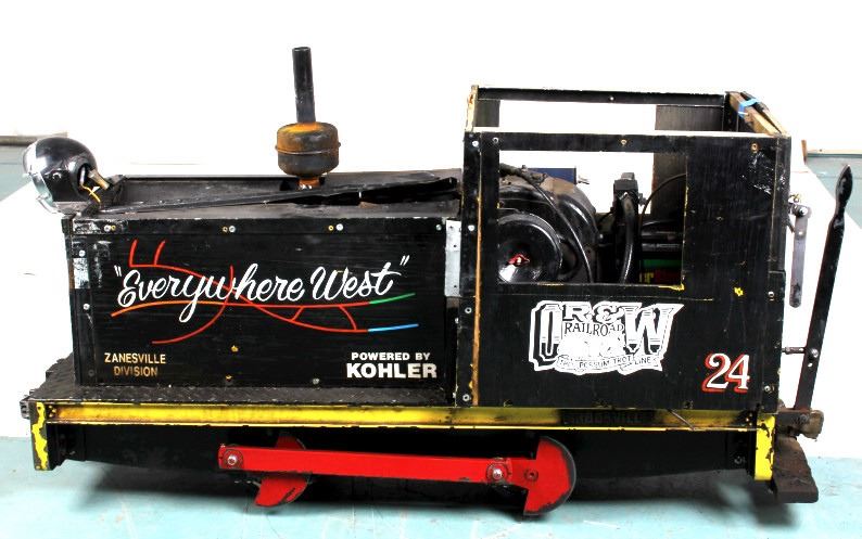 This is a 7.5" gauge live steam switcher locomotive. The locomotive came from the James Edgerley collection of the OR&W Railroad in Bozeman, Montana. The locomotive features a gas powered engine and shows OR&W Possum Trot Line graphics. The locomotive also reads "Everywhere West Zanesville Division. The locomotive is in good overall condition. It was running when last used. Bidders must rely on visual and personal inspection for condition, working order, and description correctness. The locomotive measures 19" wide, 55" long and 25" tall.