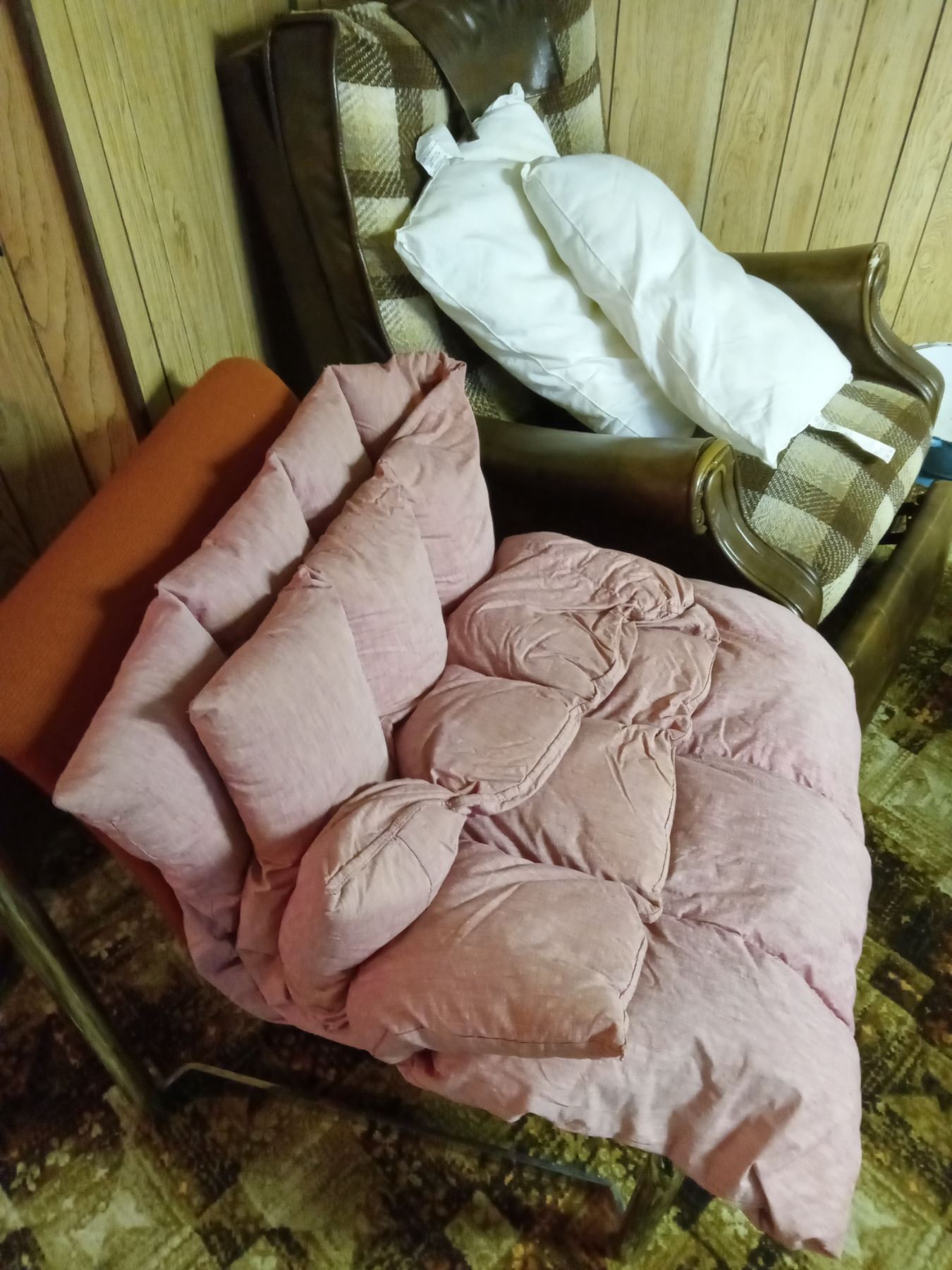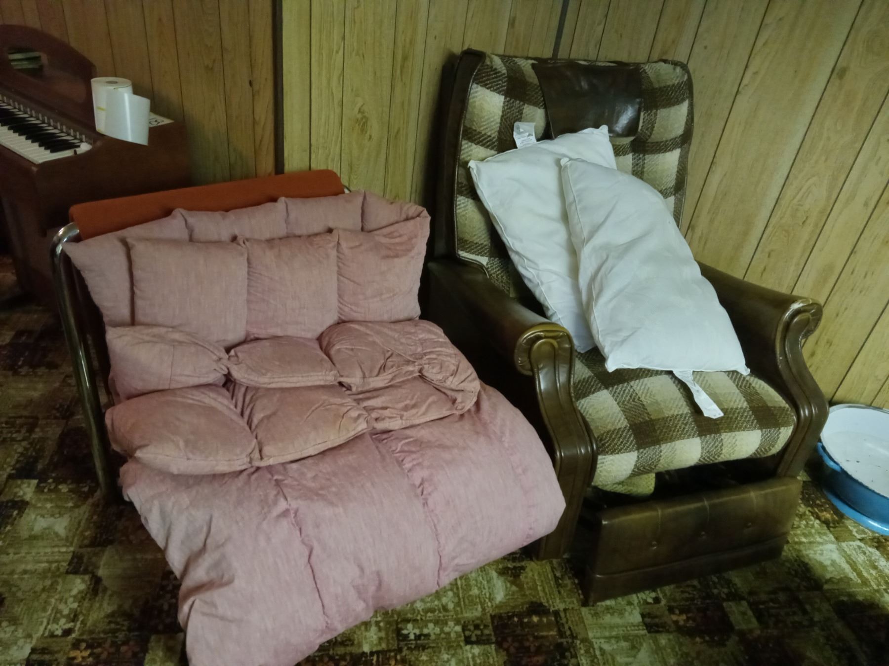 ORANGE AND METAL CHAIR, LEATHER TWEED RECLINER, HUTTERITE QUILT (APPROX QUEEN SIZE) TWO PILLOWS, TWO PICTURE FRAMES