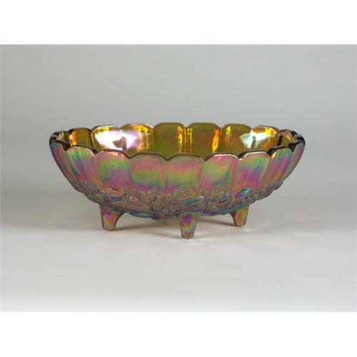 A large carnival glass footed console bowl, most likely Indiana Glass, circa 1940's-50's, 1/4'' thick glass, raised relief fruit and vegetable motif, orange iridescent color, 4.5'' x 12'' x 8.5'', a ''wrinkle'' in the glass noted on one side which looks like a small crack but is not.