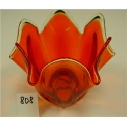 Orange flared glass vase with clear rim and polished base. 5" tall and 5" wide. Condition: Excellent