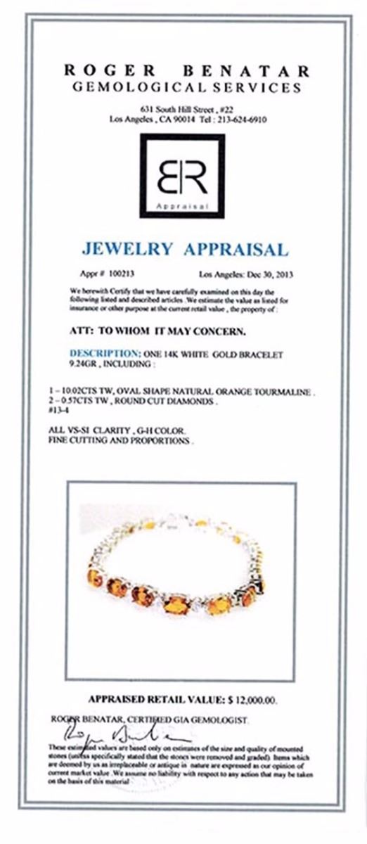 ORANGE TOURMALINE 10.02CT, 14K W/G BRACELET 9.24GRAM / DIAMOND RD 0.57CT