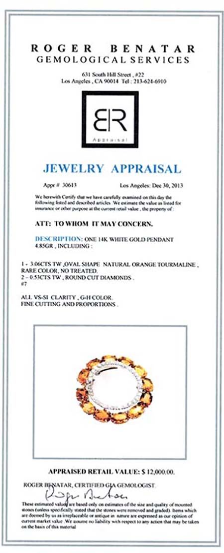 ORANGE TOURMALINE 3.06CT, 14K W/G PENDANT 4.85GRAM / DIAMOND 0.53CT