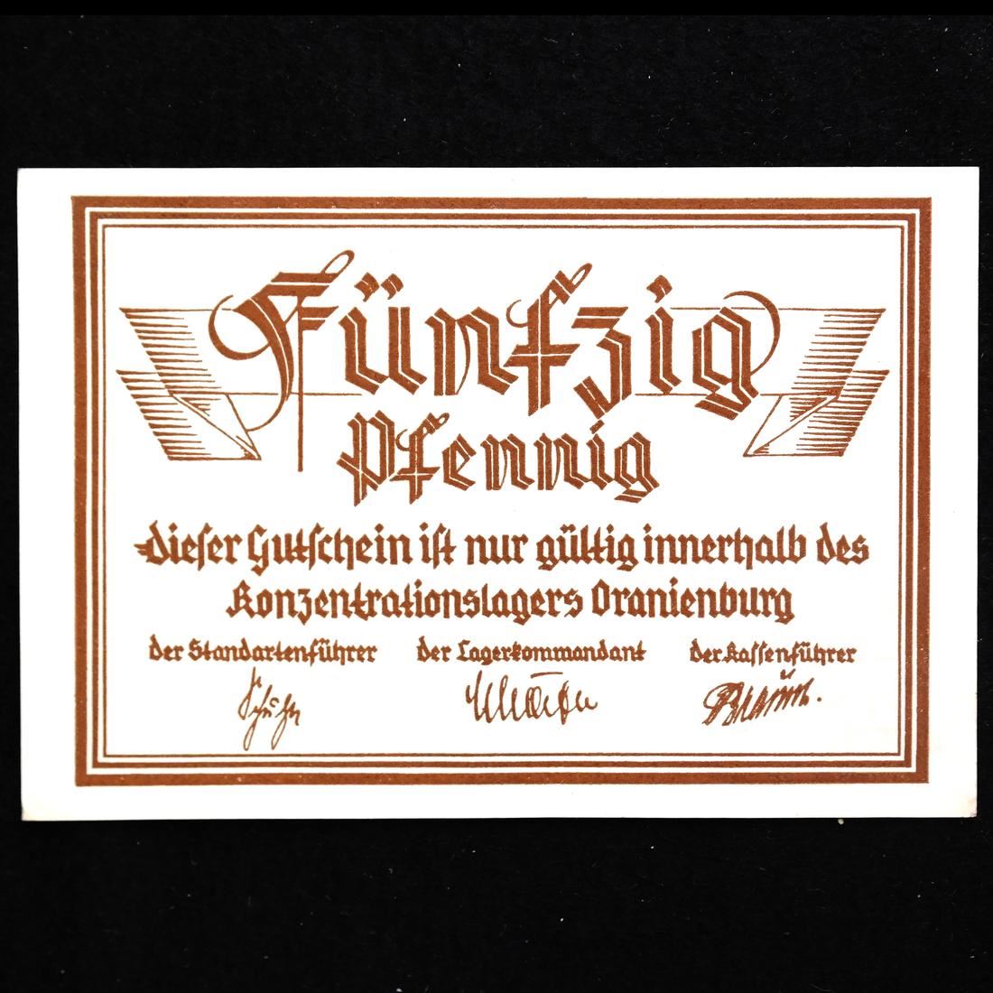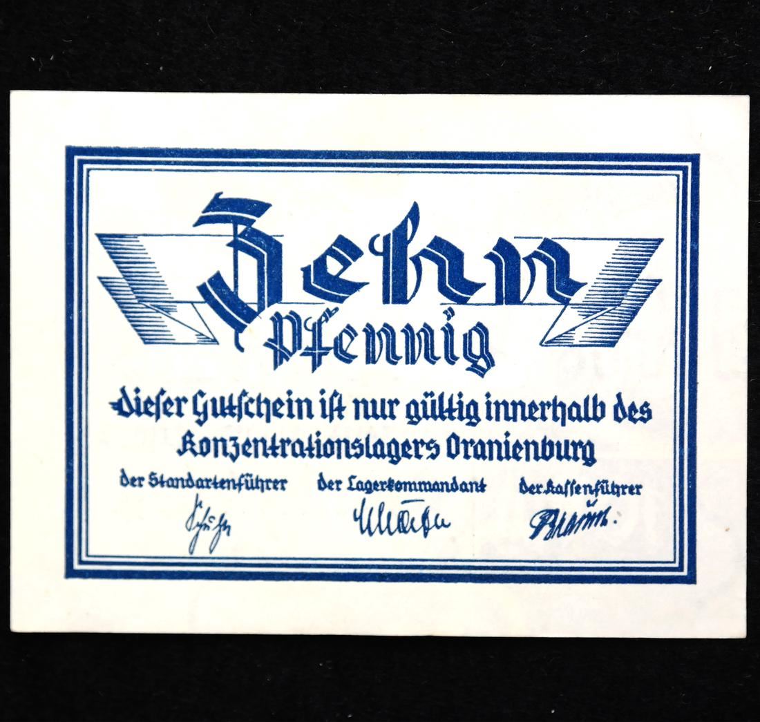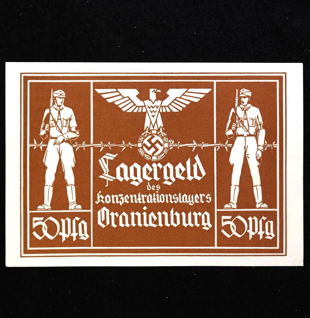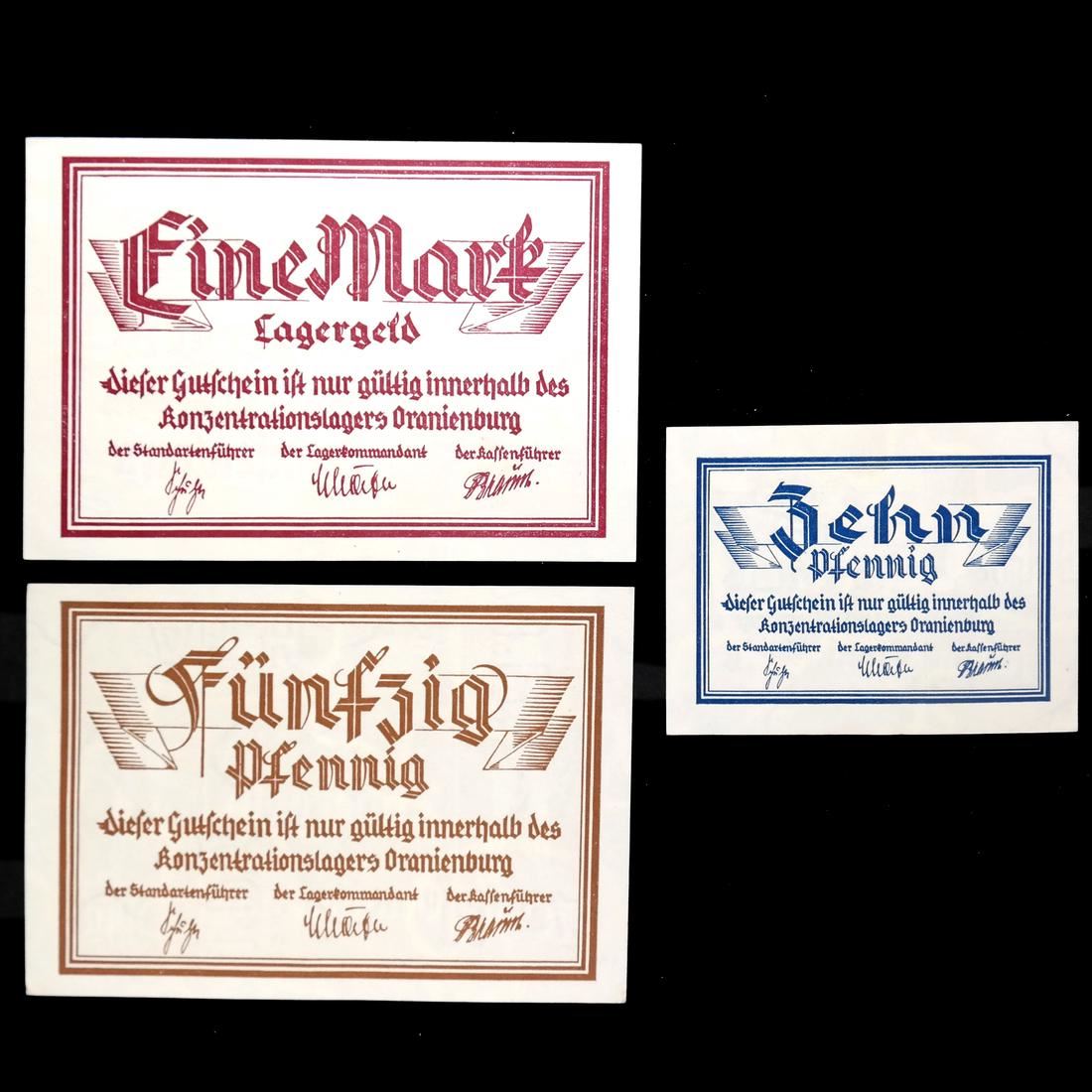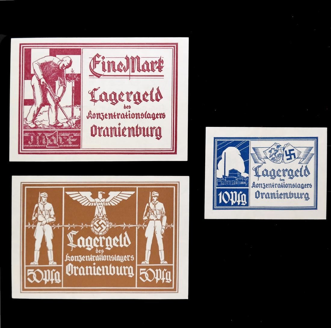 Three different Konzentrationslager Oranienburg pictorial notes on watermarked paper, 10pf, 50pf and 1RM denominations, all sound and About Uncirculated to Uncirculated.