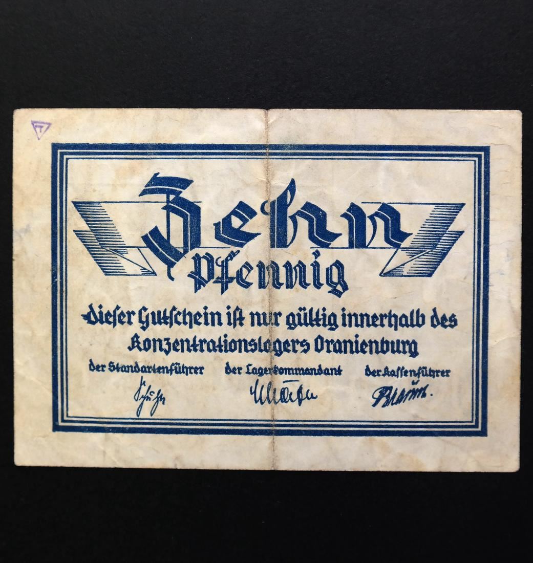 Three different Konzentrationslager Oranienburg pictorial notes on watermarked paper, 5pf, 10pf and 50pf denominations, creases, wrinkles and light soiling, sound and F-VF.