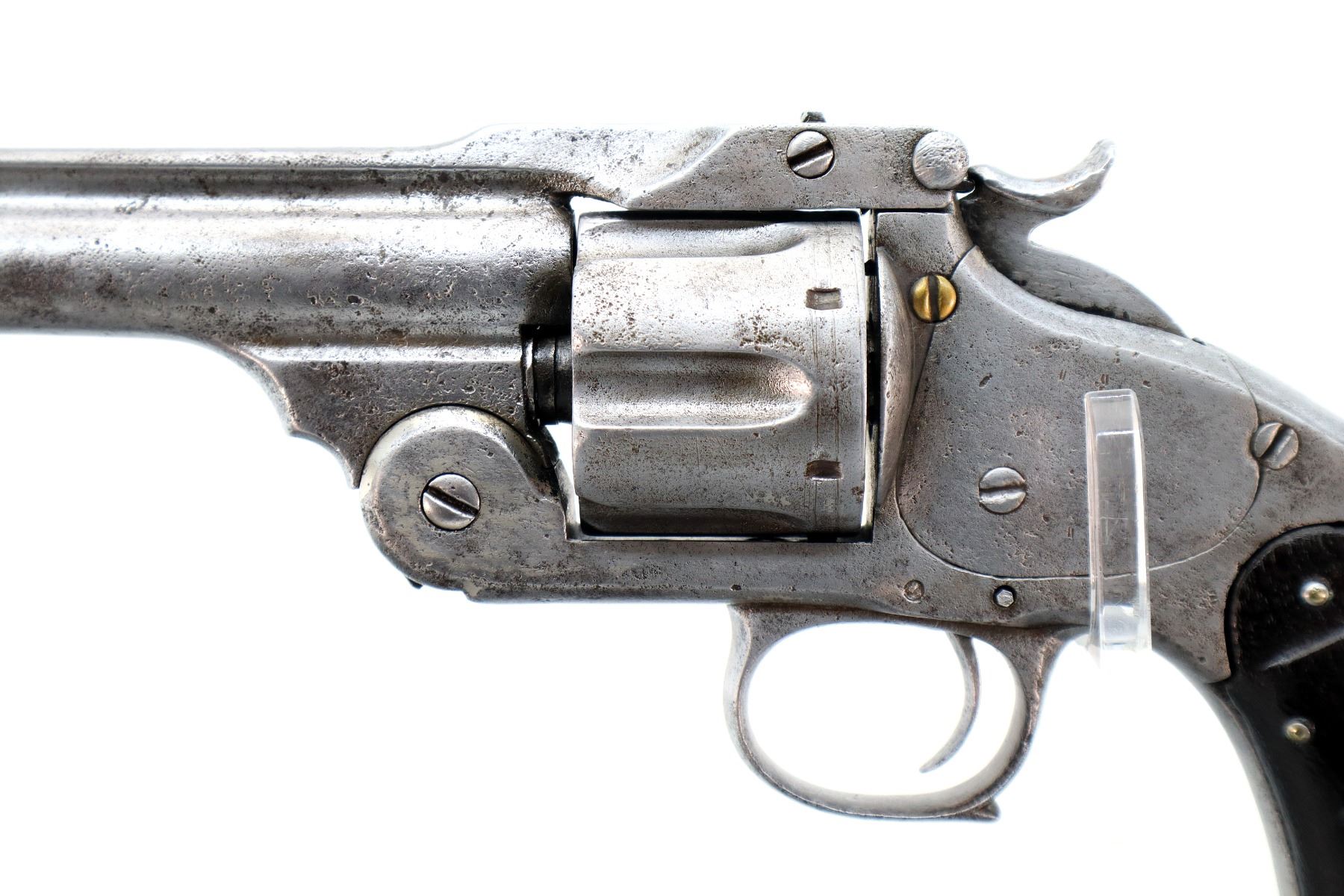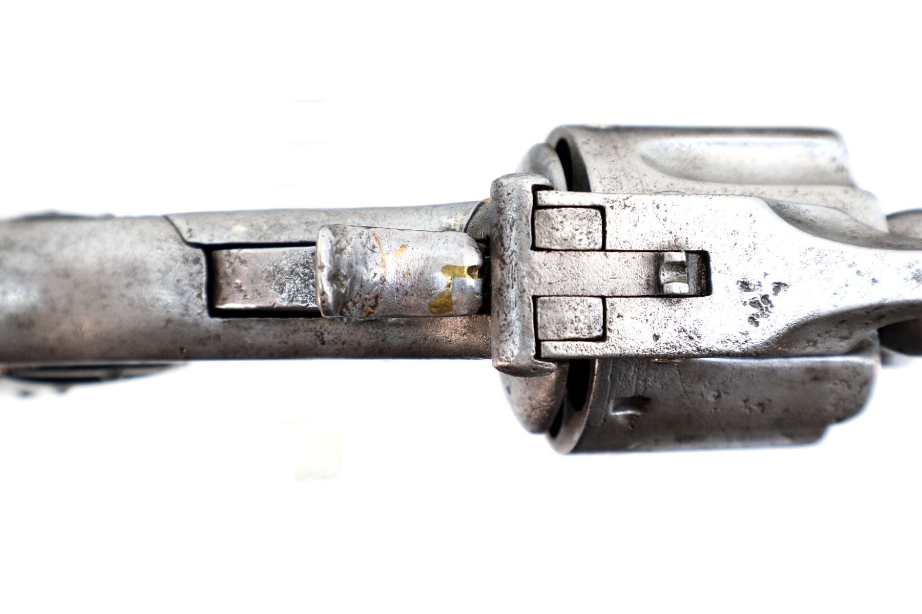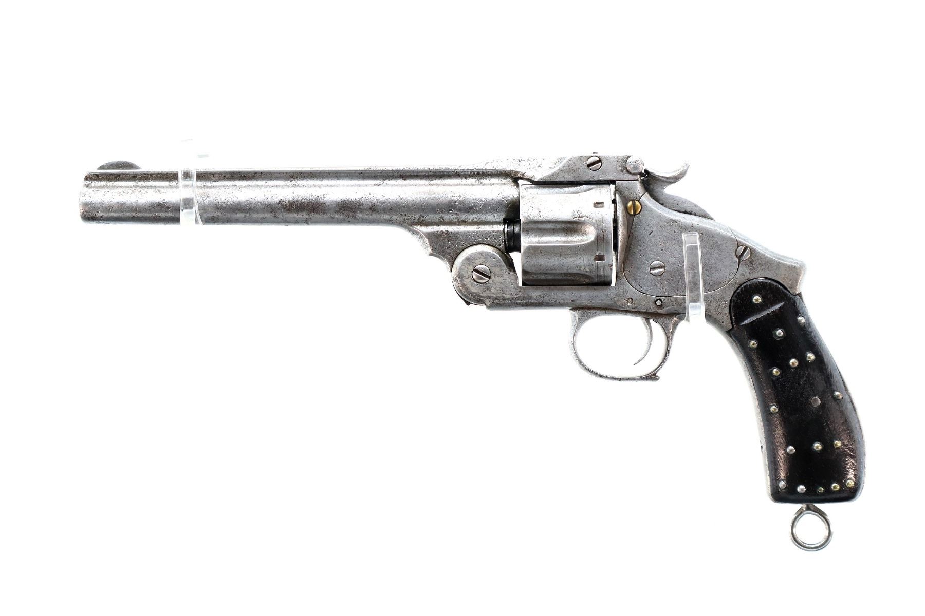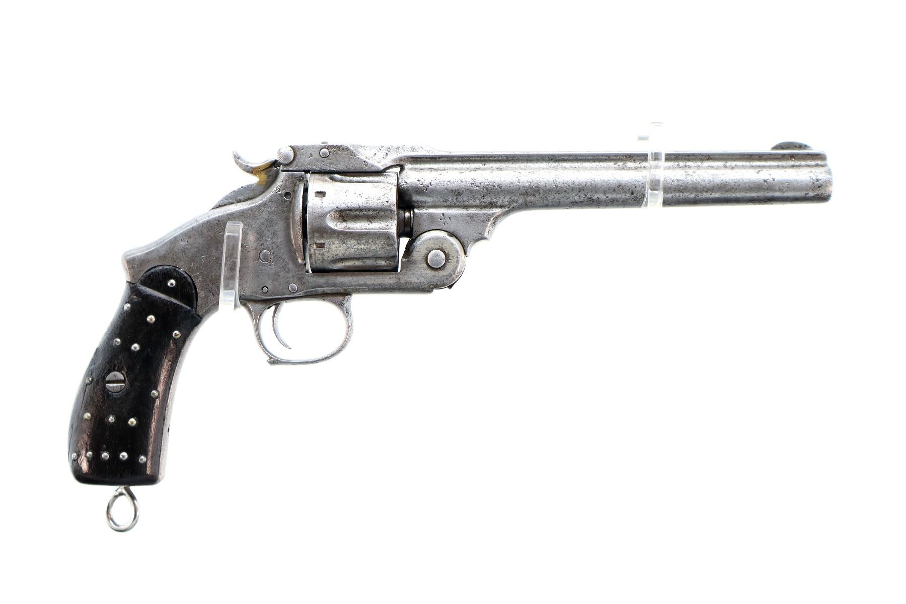 Main Description: Functions mechanically as designed, Cocks but has play in Cylinder. Blade front sight, fixed u notched rear sight, round barrel with solid rib which is loose on the frame, fluted cylinder, repaired spur hammer, side plate has one repaired screw. Two piece wood grips with replaced screw and silver pins, repaired lanyard ring, ejector does not function.
