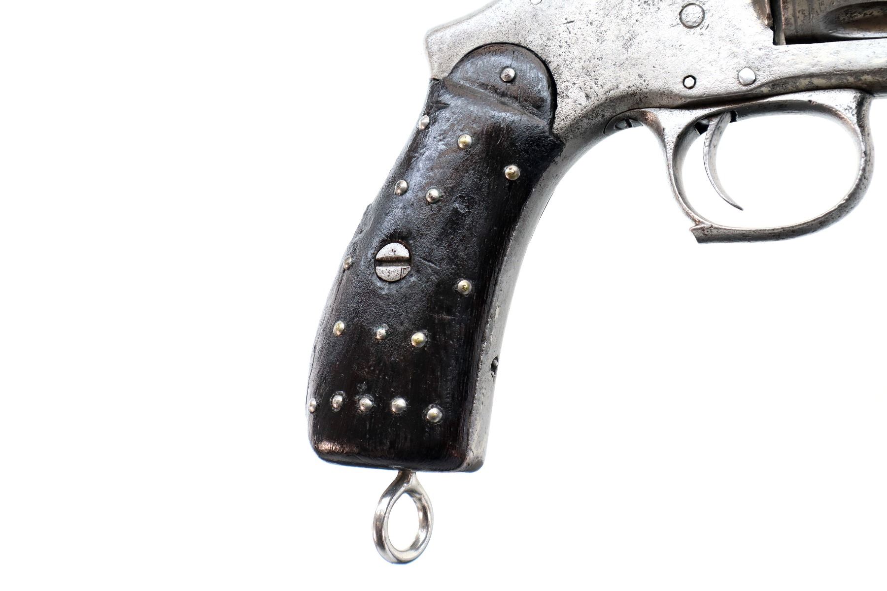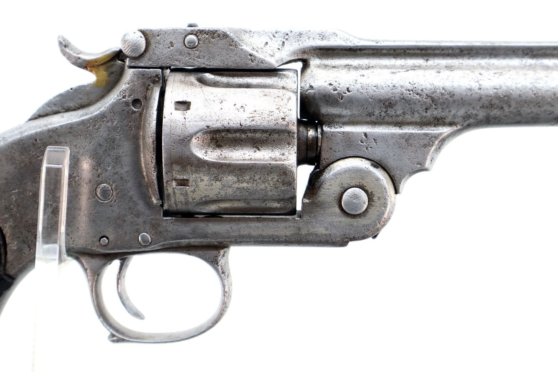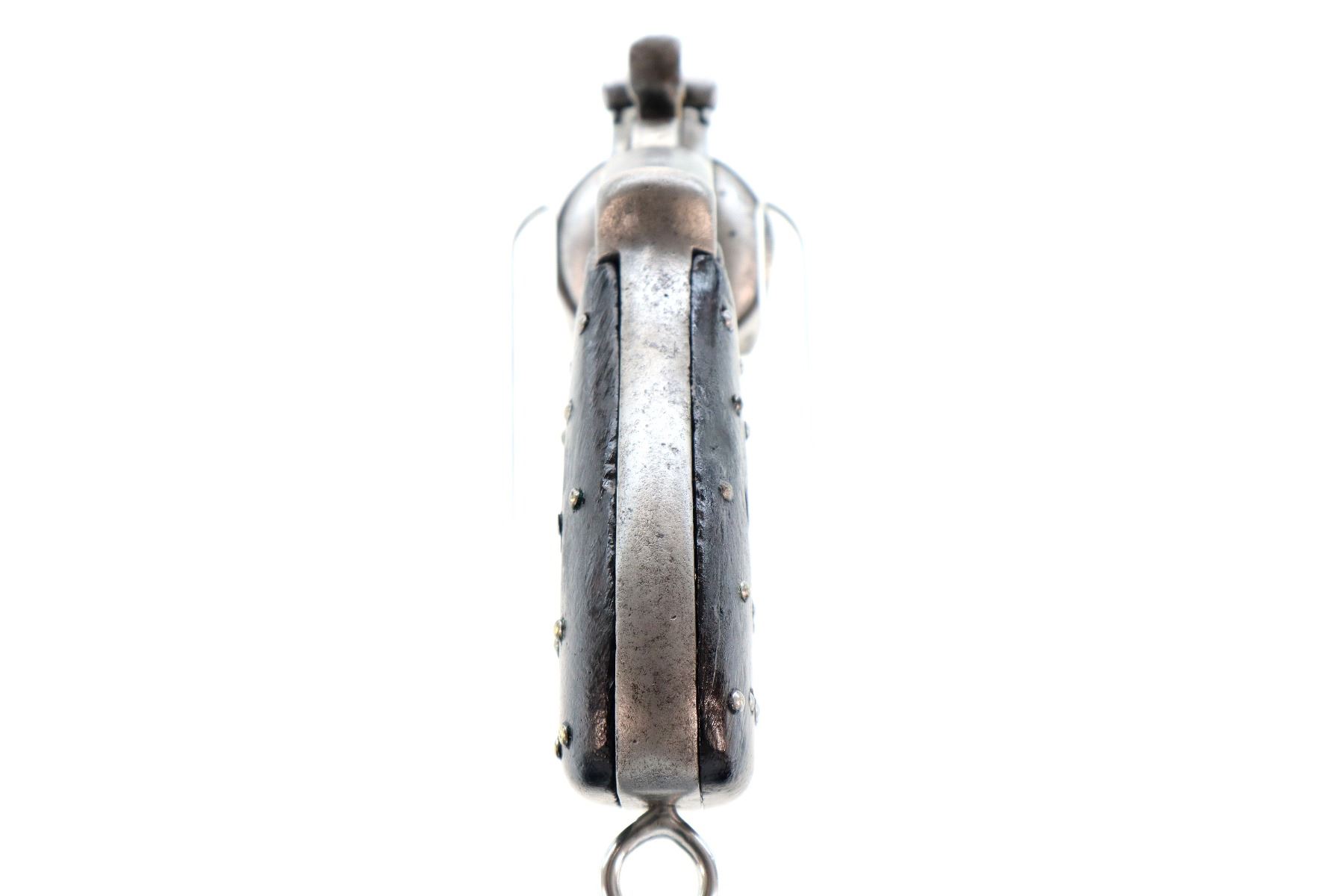 Main Description: Functions mechanically as designed, Cocks but has play in Cylinder. Blade front sight, fixed u notched rear sight, round barrel with solid rib which is loose on the frame, fluted cylinder, repaired spur hammer, side plate has one repaired screw. Two piece wood grips with replaced screw and silver pins, repaired lanyard ring, ejector does not function.