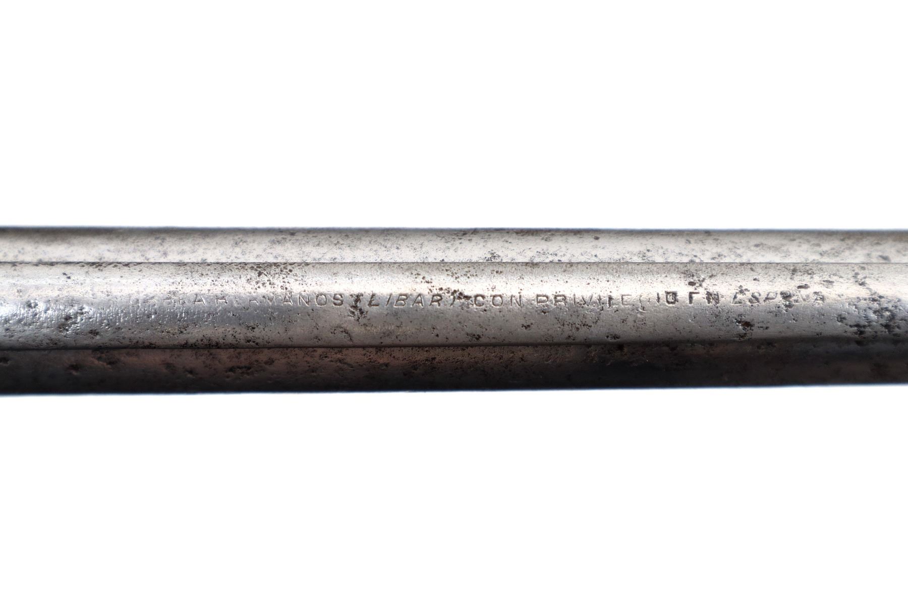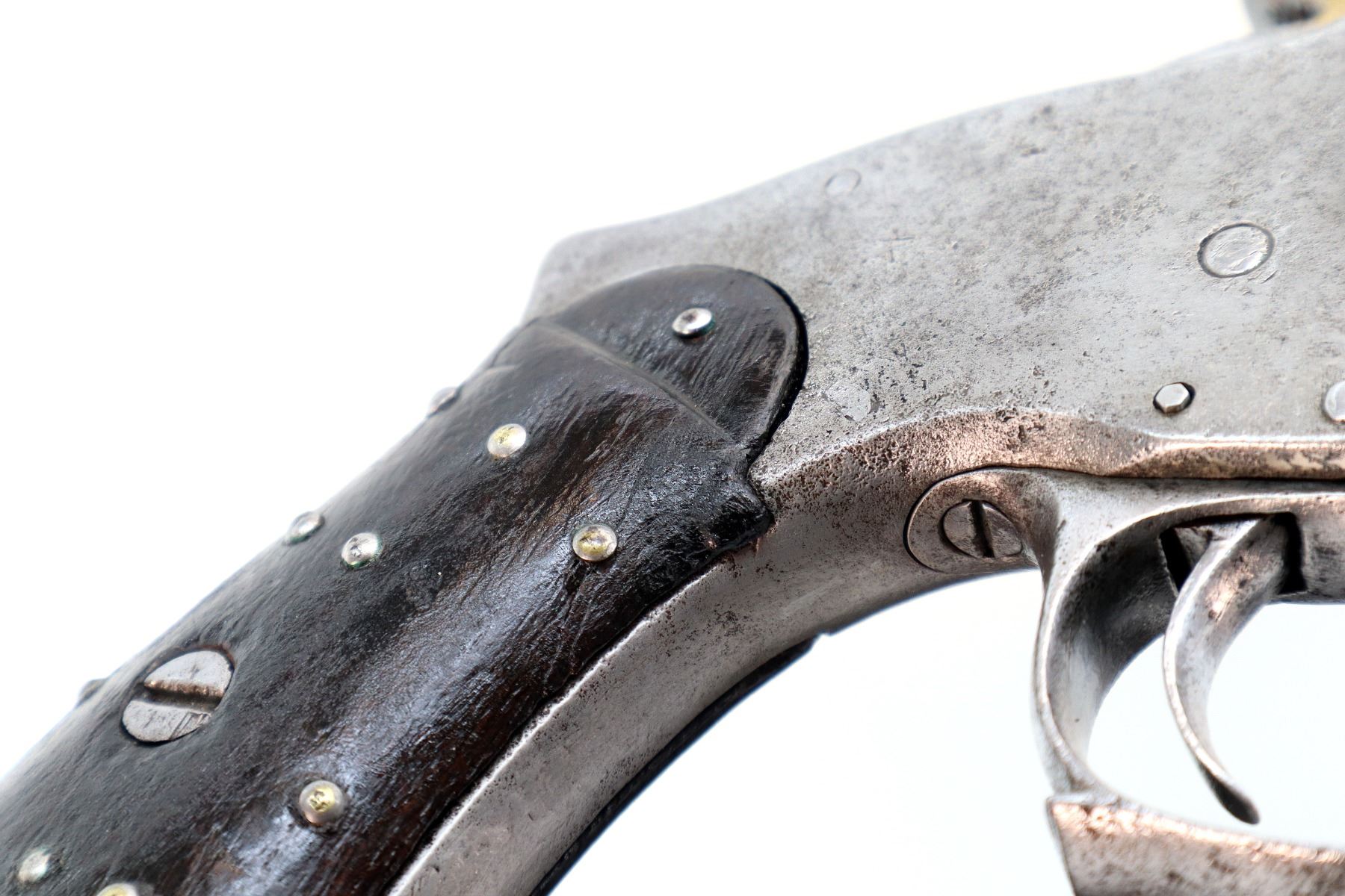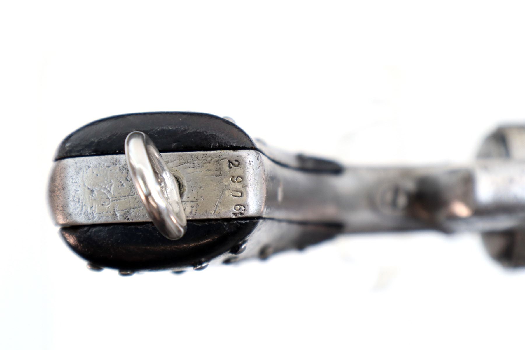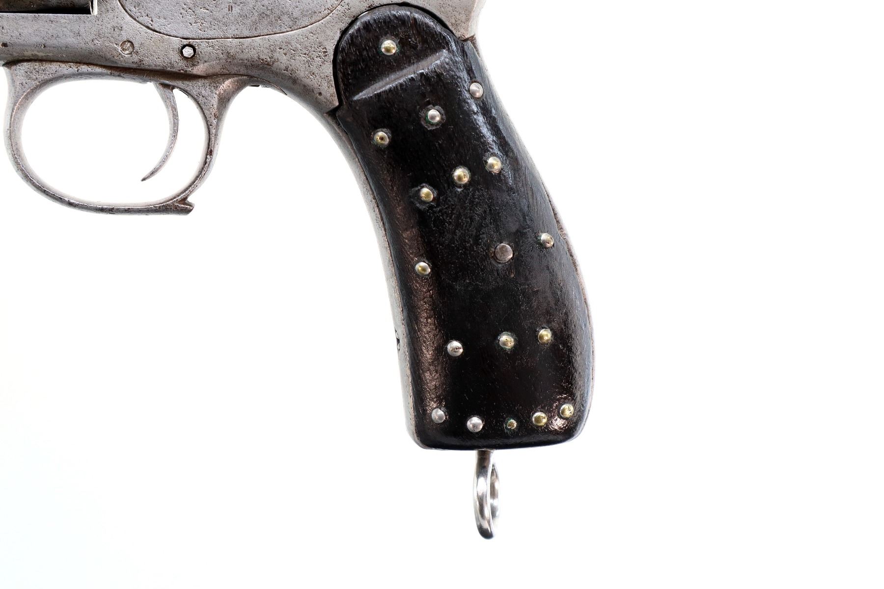 Main Description: Functions mechanically as designed, Cocks but has play in Cylinder. Blade front sight, fixed u notched rear sight, round barrel with solid rib which is loose on the frame, fluted cylinder, repaired spur hammer, side plate has one repaired screw. Two piece wood grips with replaced screw and silver pins, repaired lanyard ring, ejector does not function.