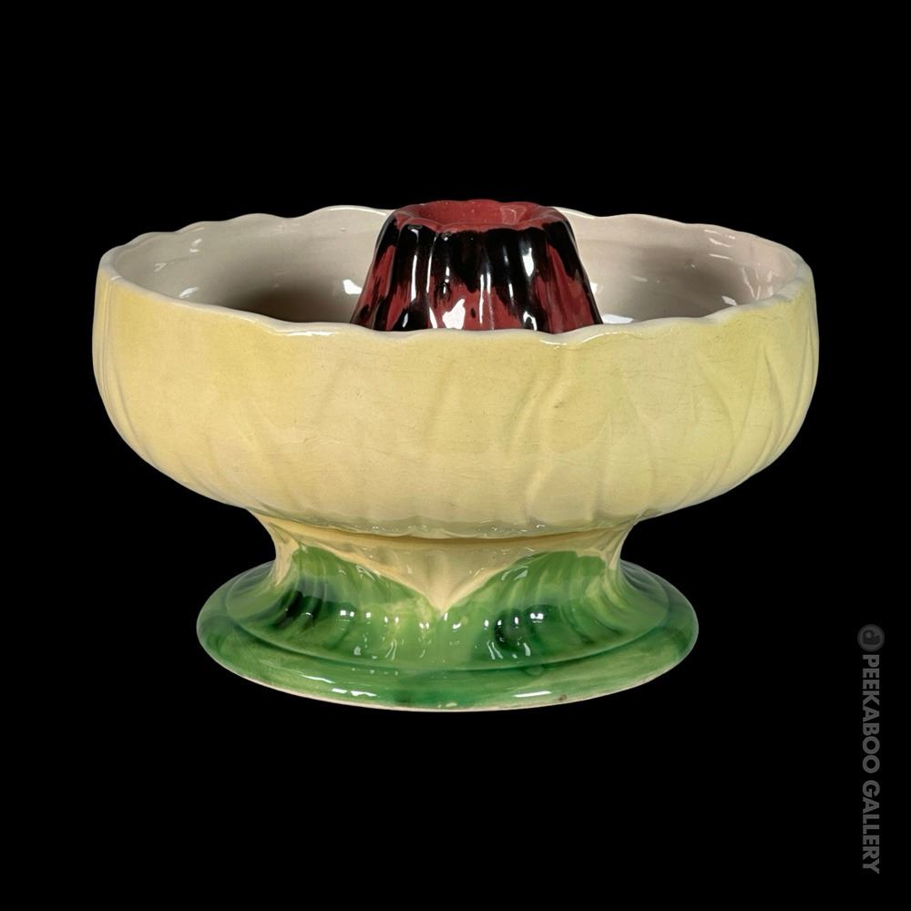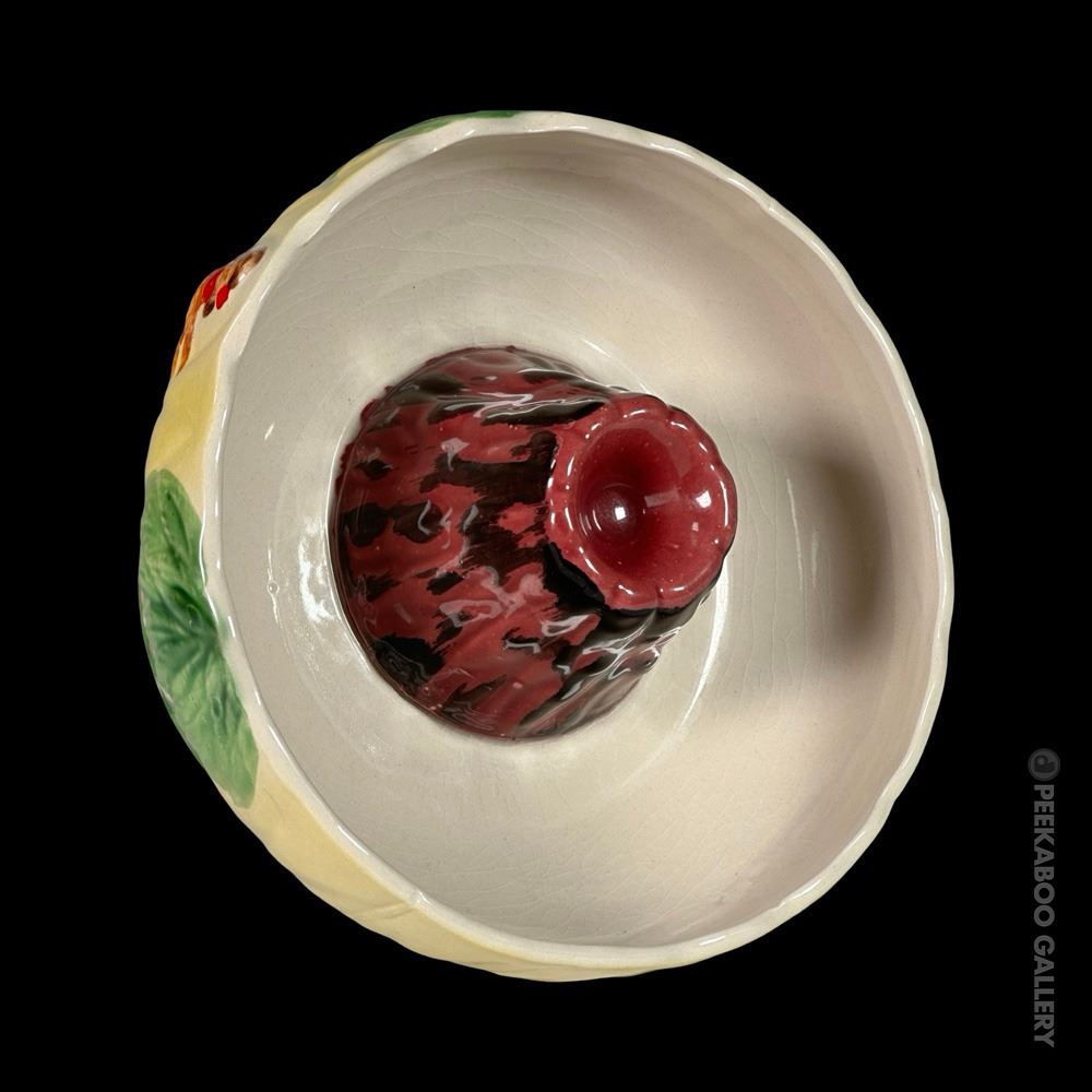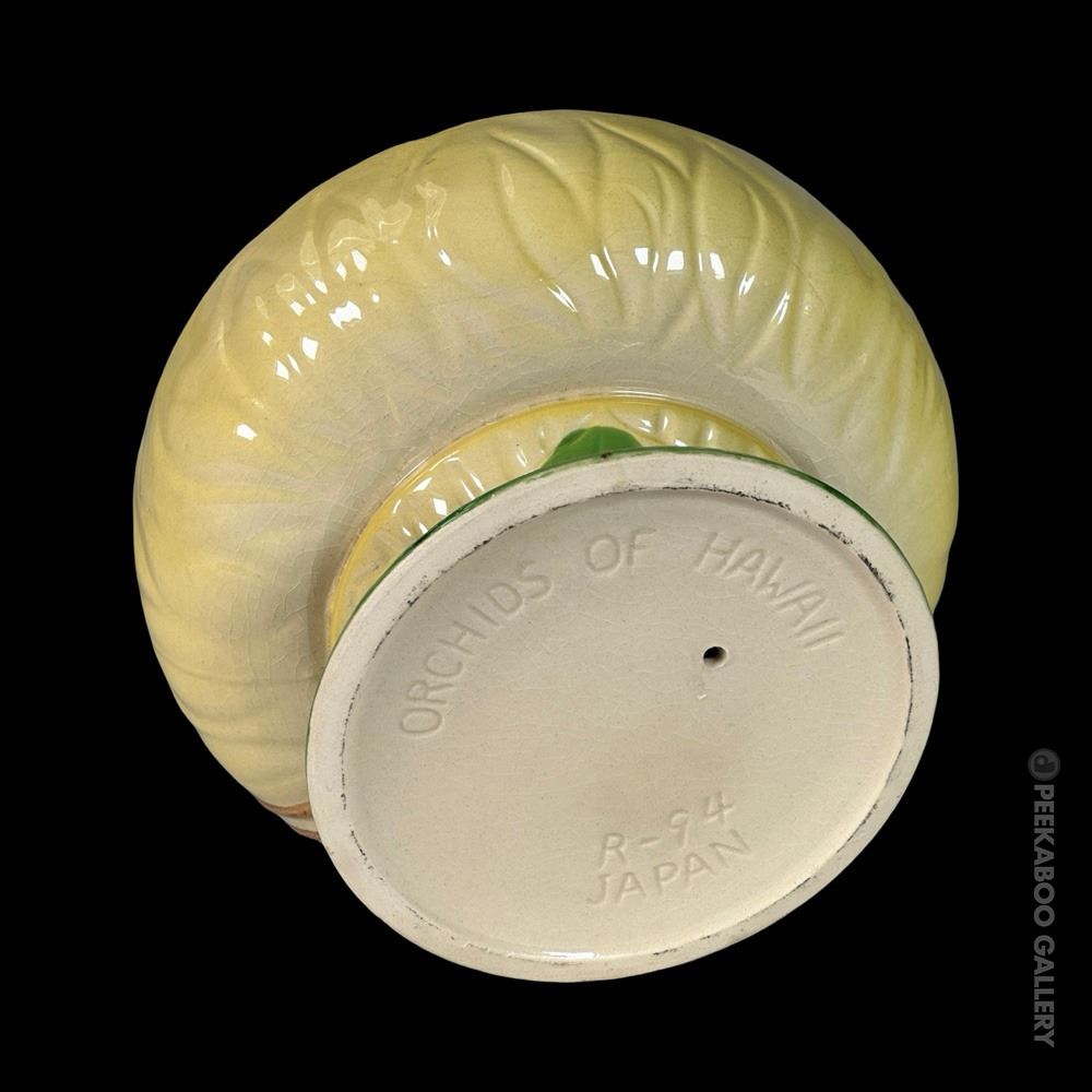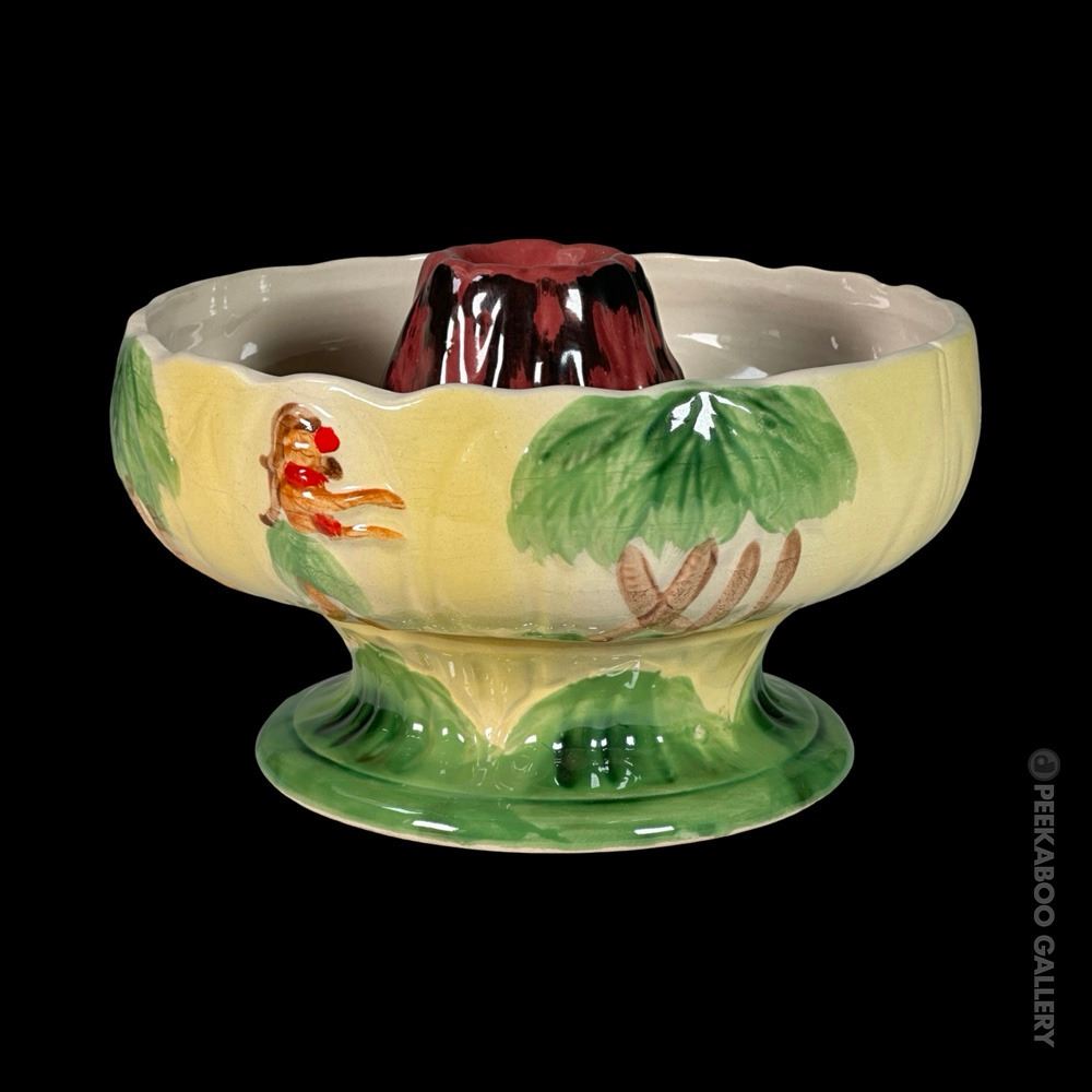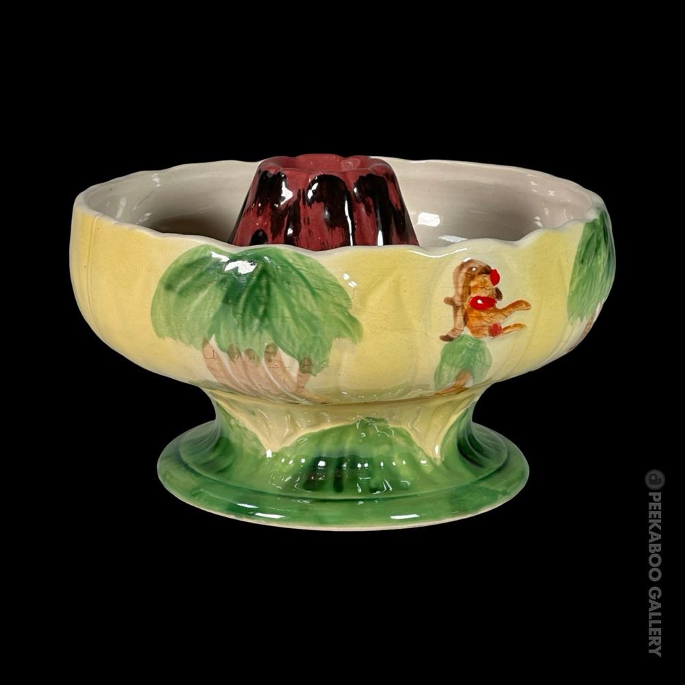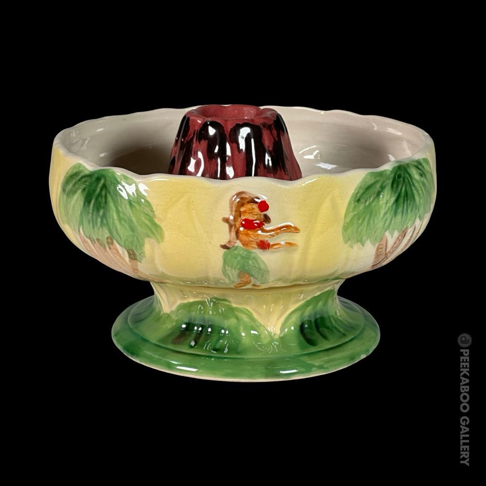 (1960s) Orchids of Hawaii offered a whole series of different config with Scorpion bowls. This one has a large central volcano in the center for the application of 151 rum, of which would be set a fire for presentation to the table. Pure Polynesian Pop theater! Features hula girls and swaying palms across the sides. *BOOZE CAVE COLLECTION. VG+. 5.5"x8.5"dia.