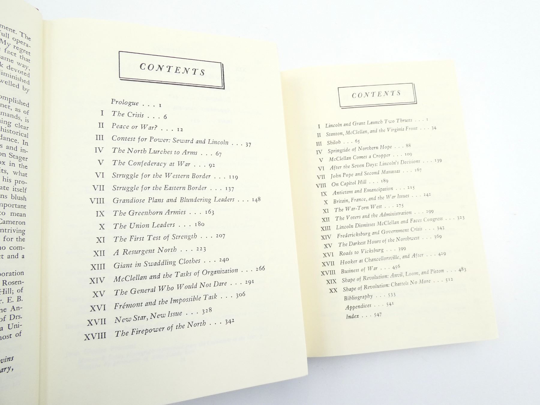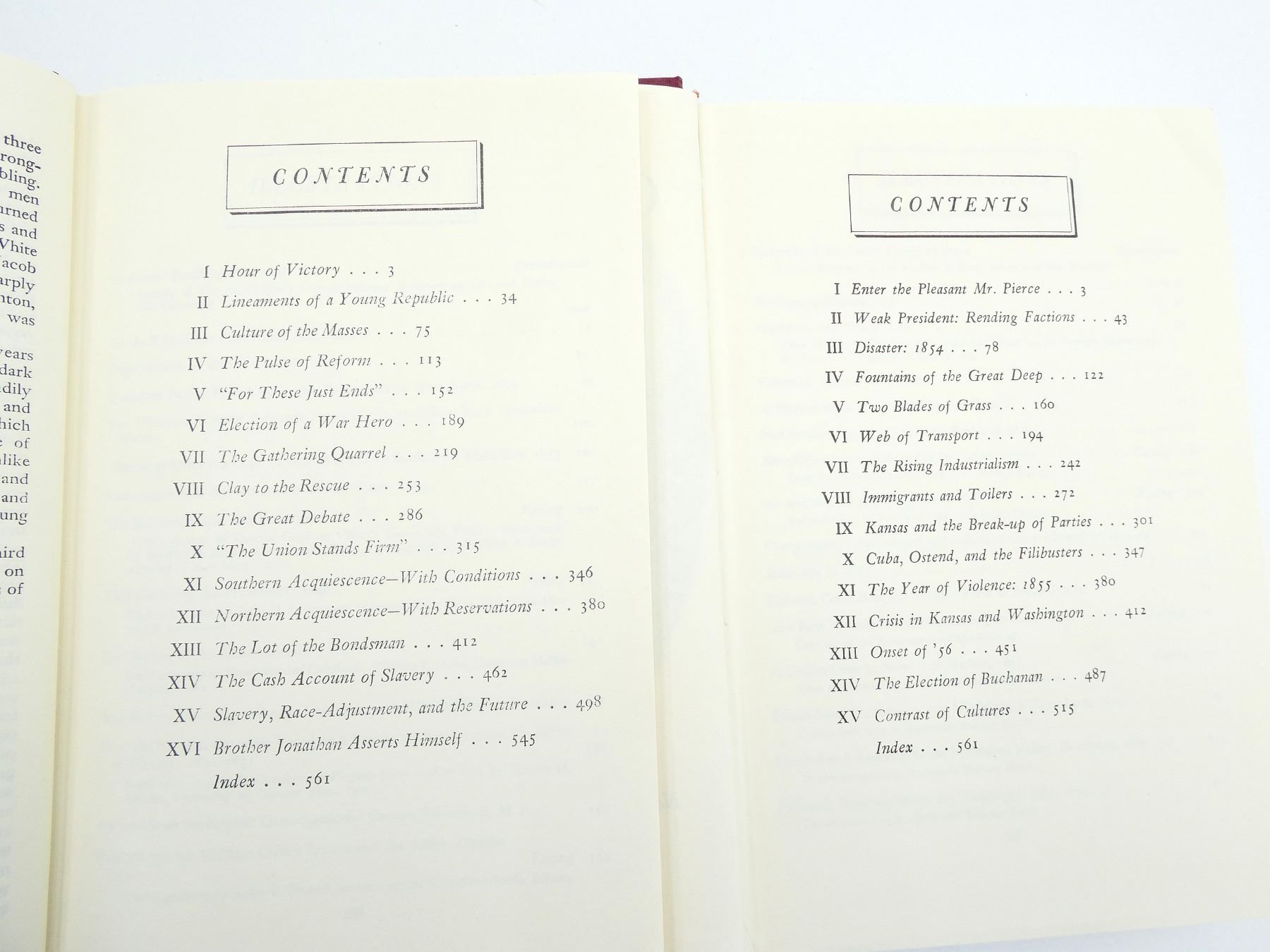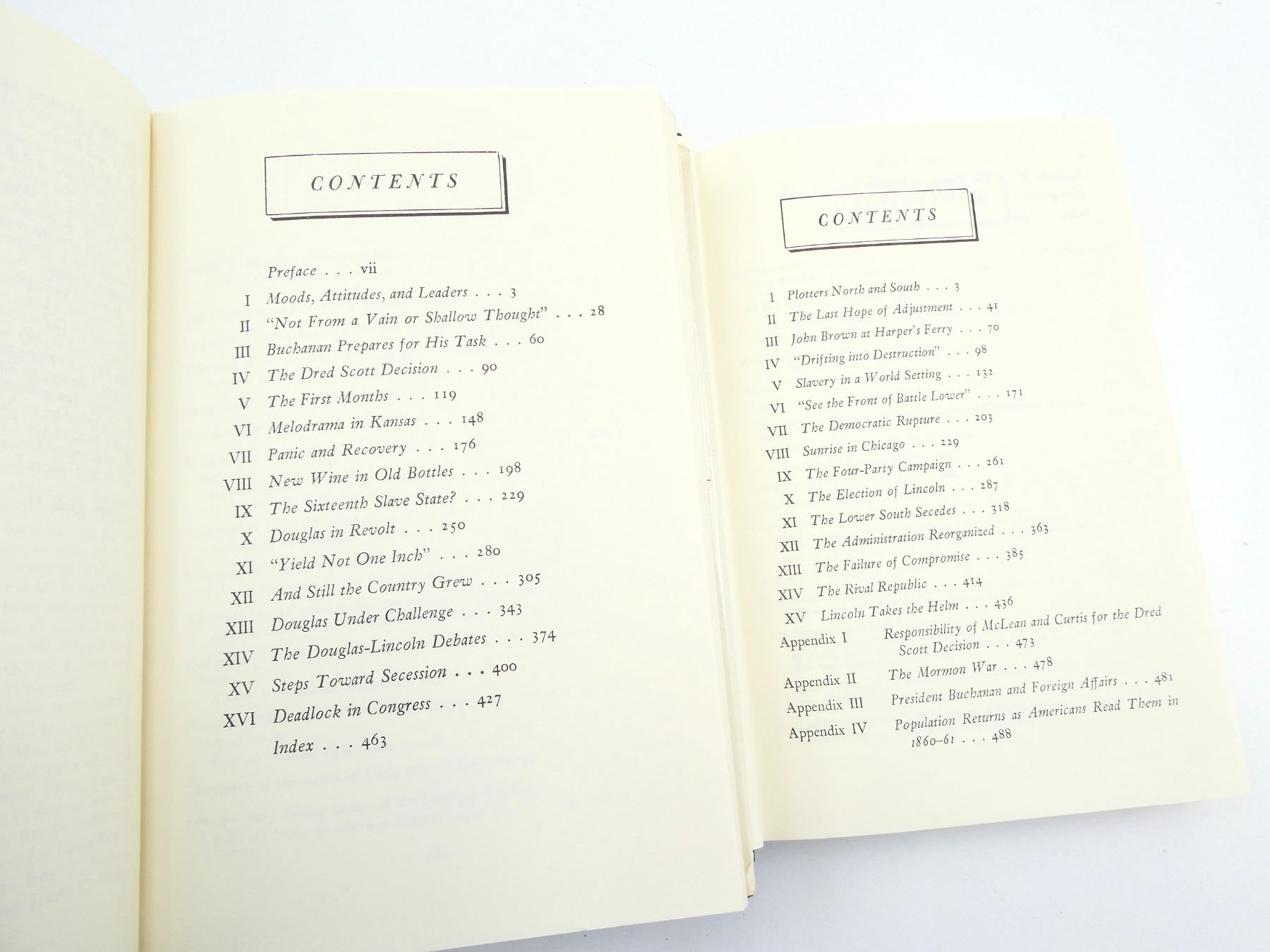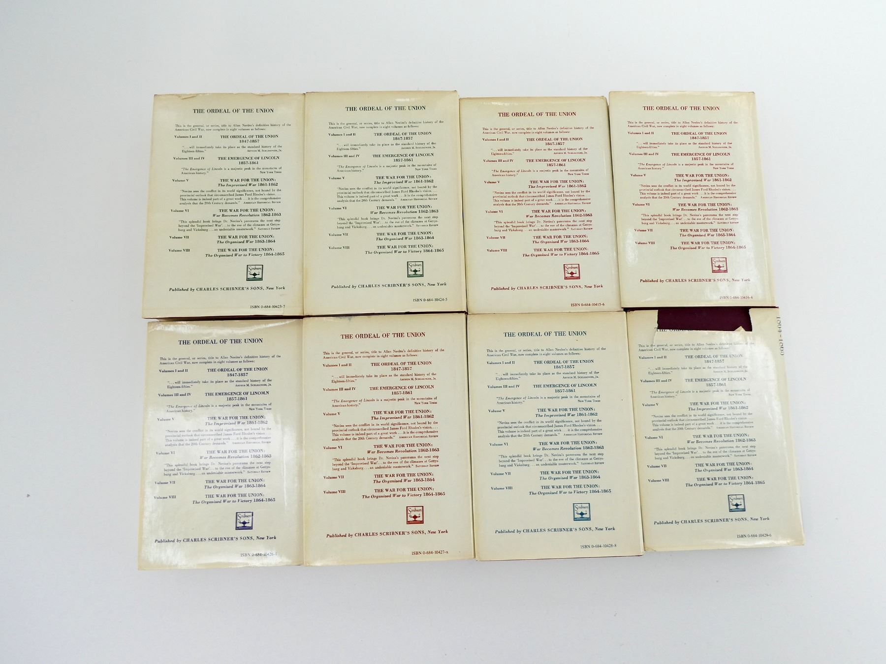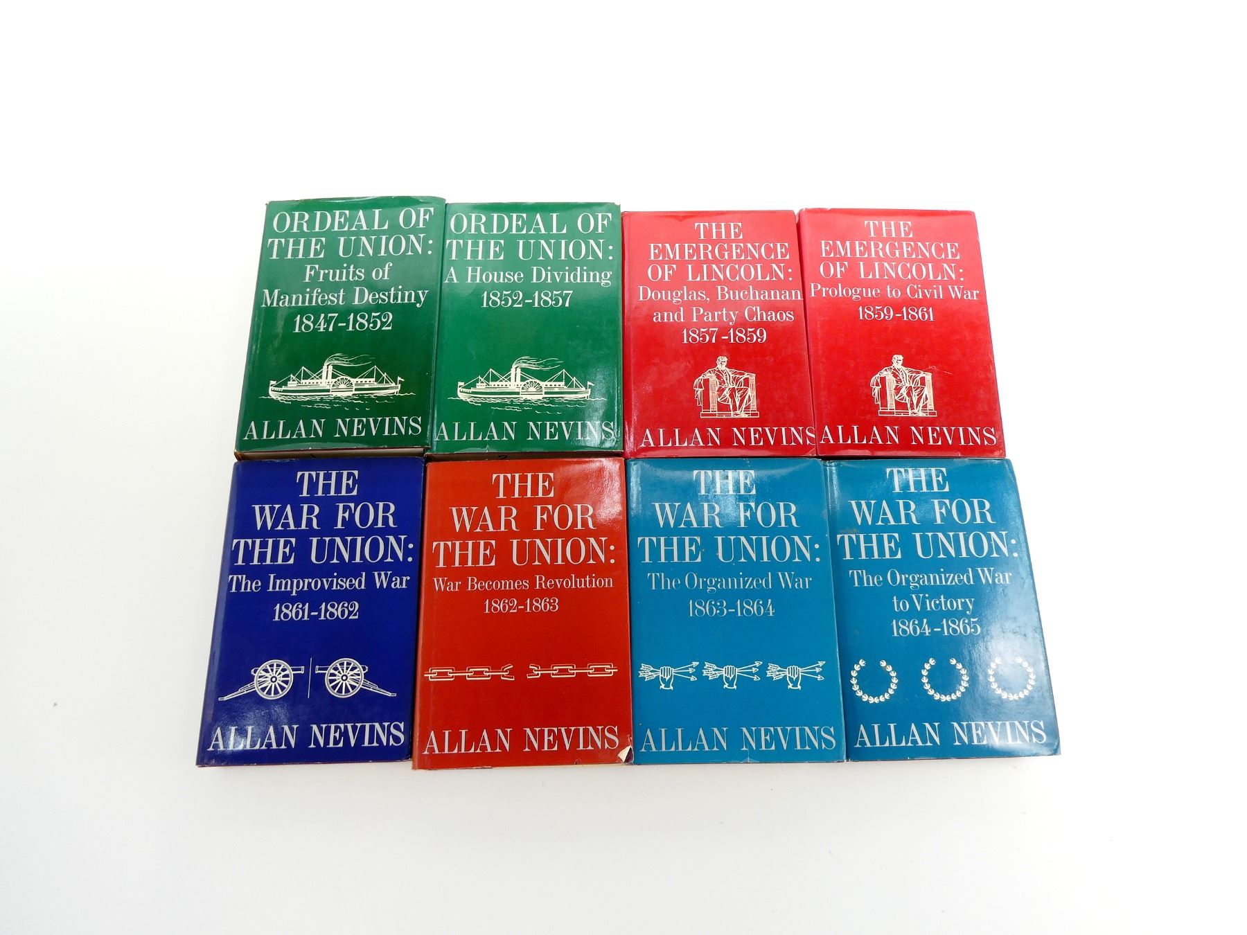 HARD COVERS WITH DUST COVERS, AUTHOR ALLAN NEVINS, LOT INCLUDES; (1) "ORDEAL OF THE UNION: FRUITS OF MANIFEST DESTINY 1847-1852" BOOK, ISBN: 0-684-10423-7, (1) "ORDEAL OF THE UNION: A HOUSE DIVIDING 1852-1857" BOOK, ISBN: 0-684-10424-5, (1) "THE EMERGENCE OF LINCOLN: DOUGLAS, BUCHANAN AND PARTY CHAOS 1857-1859" BOOK, ISBN: 0-684-10415-6, (1) "THE EMERGENCE OF LINCOLN: PROLOGUE TO CIVIL WAR 1859-1861" BOOK, ISBN: 0-684-10416-4, (1) "THE WAR FOR THE UNION: THE IMPROVISED WAR 1861-1862" BOOK, ISBN: 0-684-10426-1, (1) "THE WAR FOR THE UNION: WAR BECOMES REVOLUTION 1862-1863" BOOK, ISBN: 0-684-10427-X, (1) "THE WAR FOR THE UNION: THE ORGANIZED WAR 1863-1864" BOOK, ISBN: 0-684-10428-8 & (1) "THE WAR FOR THE UNION: THE ORGANIZED WAR TO VICTORY 1864-1865" BOOK, ISBN: 0-684-10429-6. SEE PHOTOS.