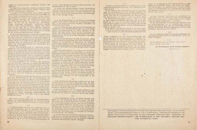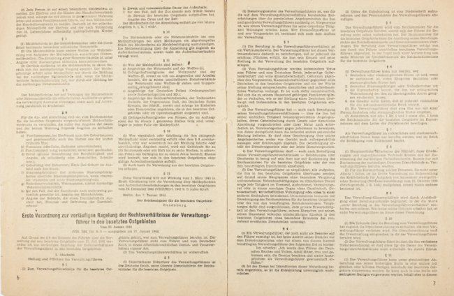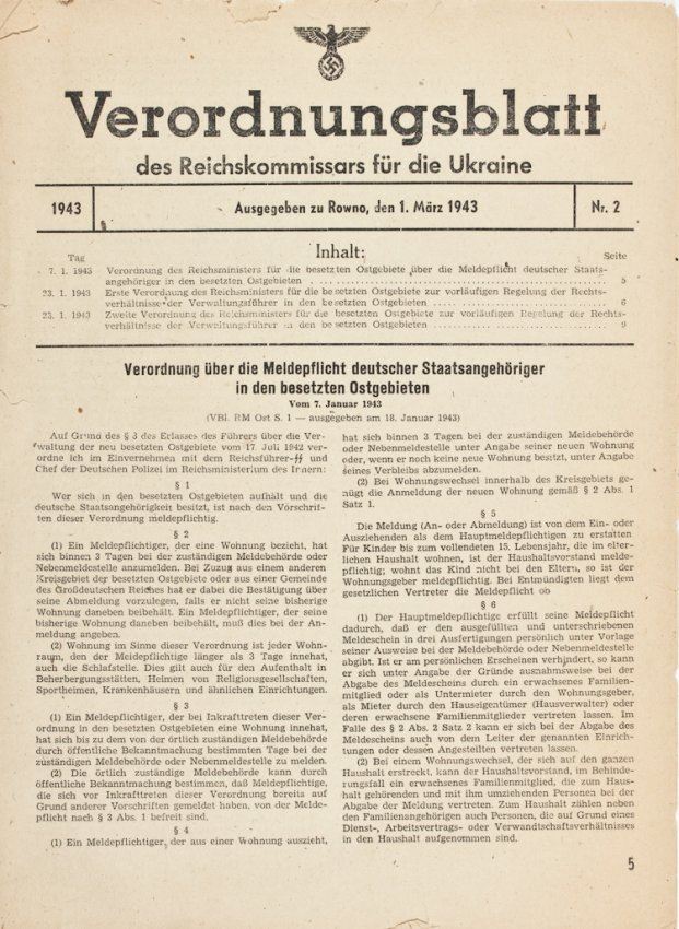 Printed document 7pp. 4to., Rowno (Rivne), Ukraine, Mar. 1, 1943, "Order of the Reich Commissioner of Ukraine". Printed in German, it instructs German citizens on how to conduct themselves in occupied eastern territories, including registering with the police within three days of arrival, reporting children up to the age of 15, making sure service officers wear a uniform, and so forth. The Reich Commissariat of Ukraine was a civilian occupation regime whose tasks included maintaining peace within the region and exploitation of persons and resources for the benefit of Germany. Light wear, toned a bit, very good.