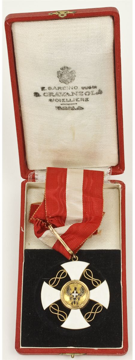 Italian award, the Order of the Crown of Italy, a large gold-edged white enamel cross with gold knots between the arms and a gold loop for neck ribbon suspension. The face has a deep blue enamel background with the gold crown of Savoy with red, white and green "jewels"; the reverse with a gold central medallion bearing the crowned eagle of Savoy. With ribbon in maker Cavanzolla's fitted, hinged box. The Order was established in 1868 by Vittorio Emanuele II, first king of unified Italy to commemorate unification. It was intended to reward outstanding service to Italy and was awarded to both Italian and non-Italian citizens. It became obsolete with the end of the Italian monarchy at the end of World War II.